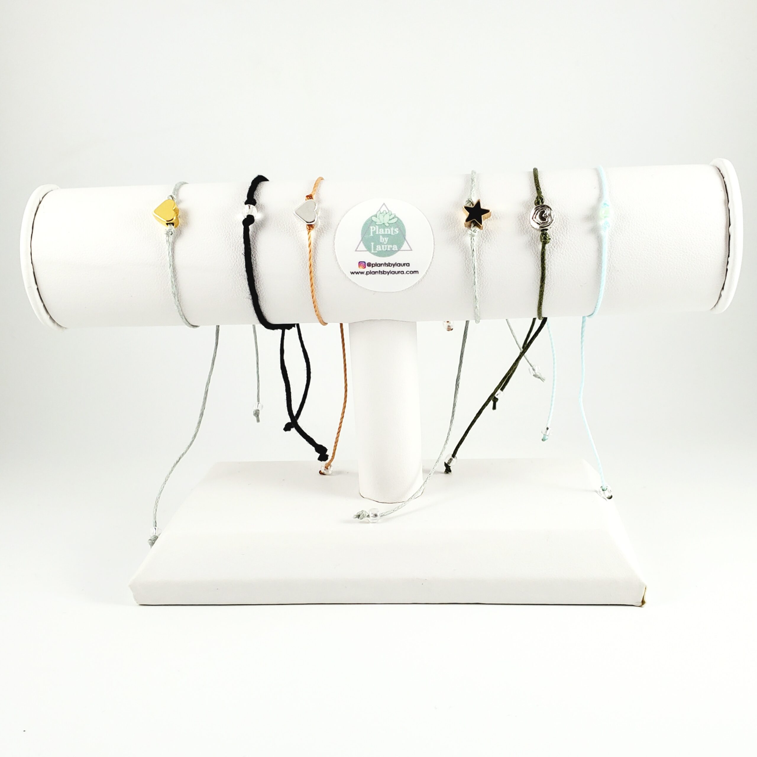 Each bracelet is made from nylon thread with a single bead securely knotted on both ends. The bracelet is made with a box knot closure, meant to be easily removable by pulling the strings. Each string is finished with a knotted clear glass bead at each end.