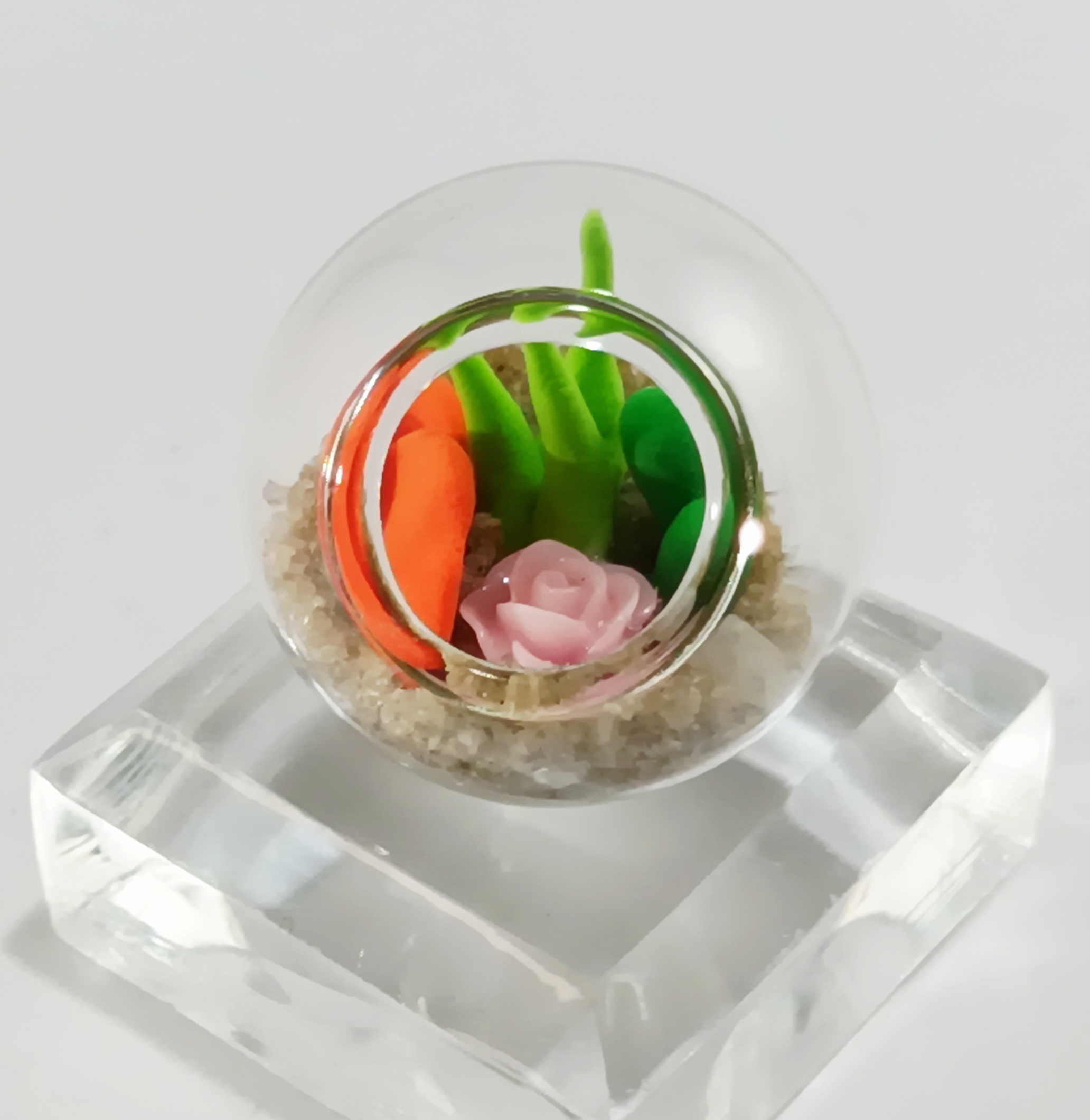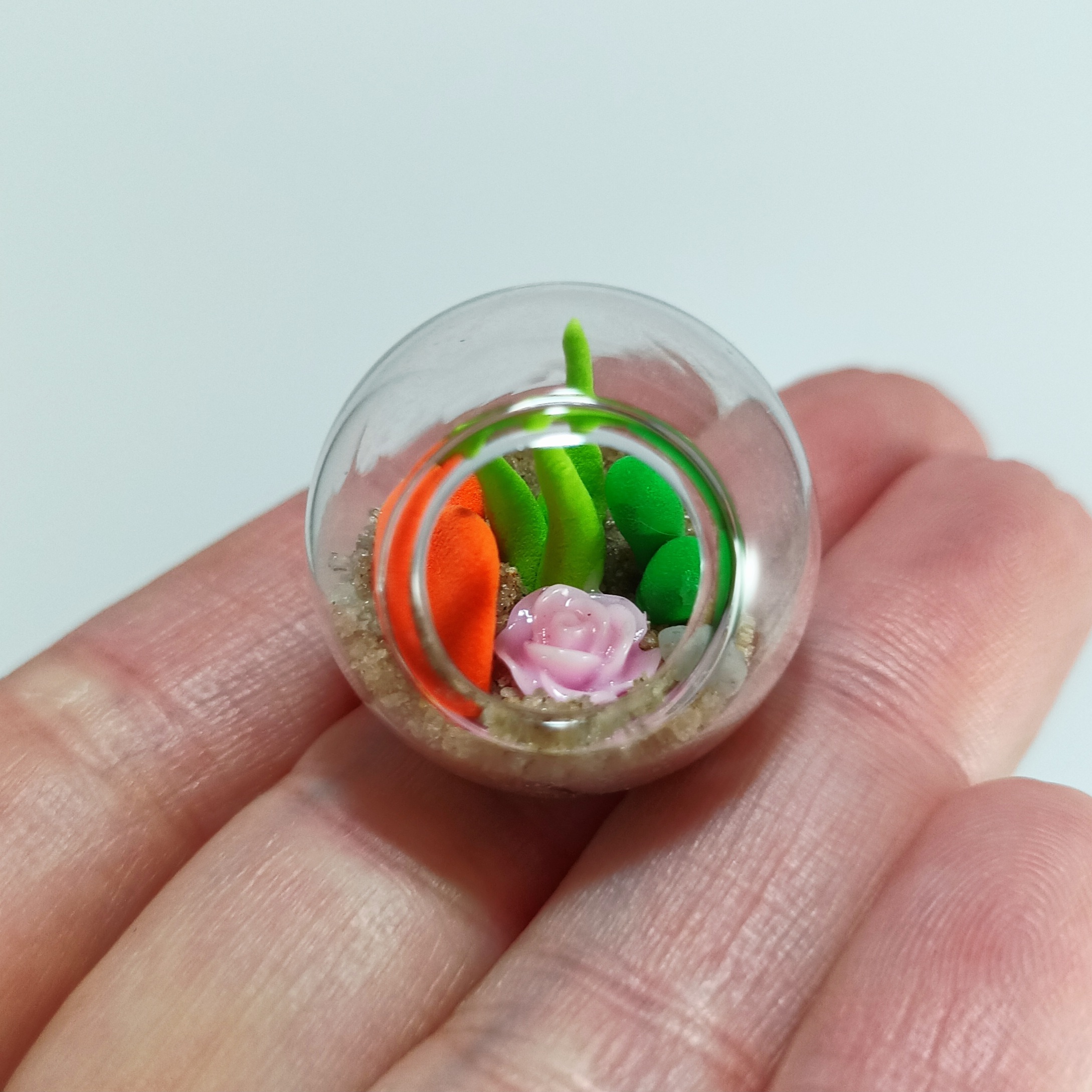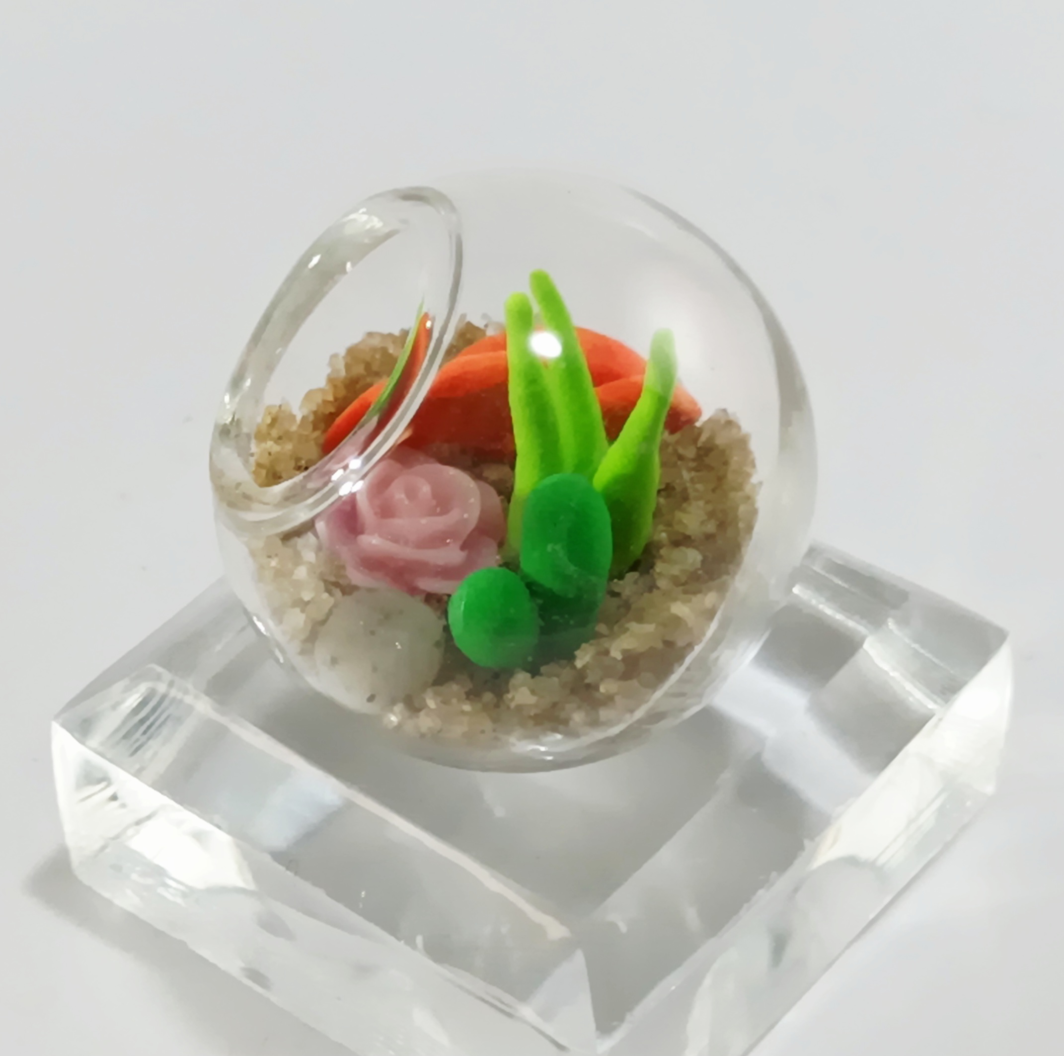This glass micro terrarium (less than an inch!) features hand-sculpted clay plants nestled in real hardened sand for lasting stability. Each plant is lovingly handmade from polymer or air-dry clay—a real forever garden.