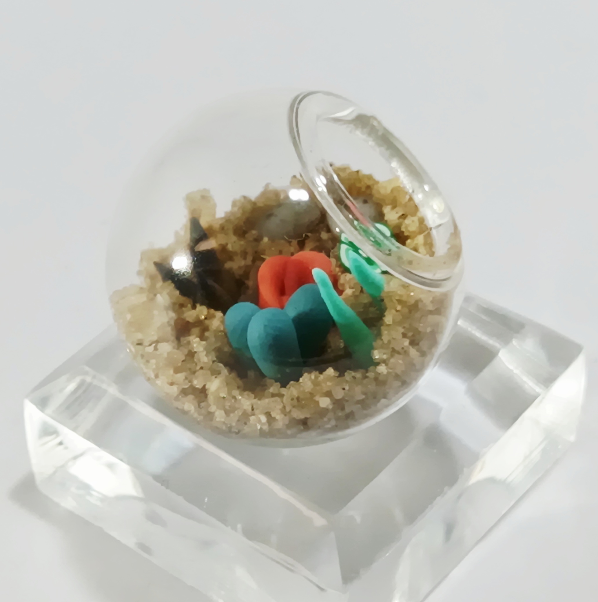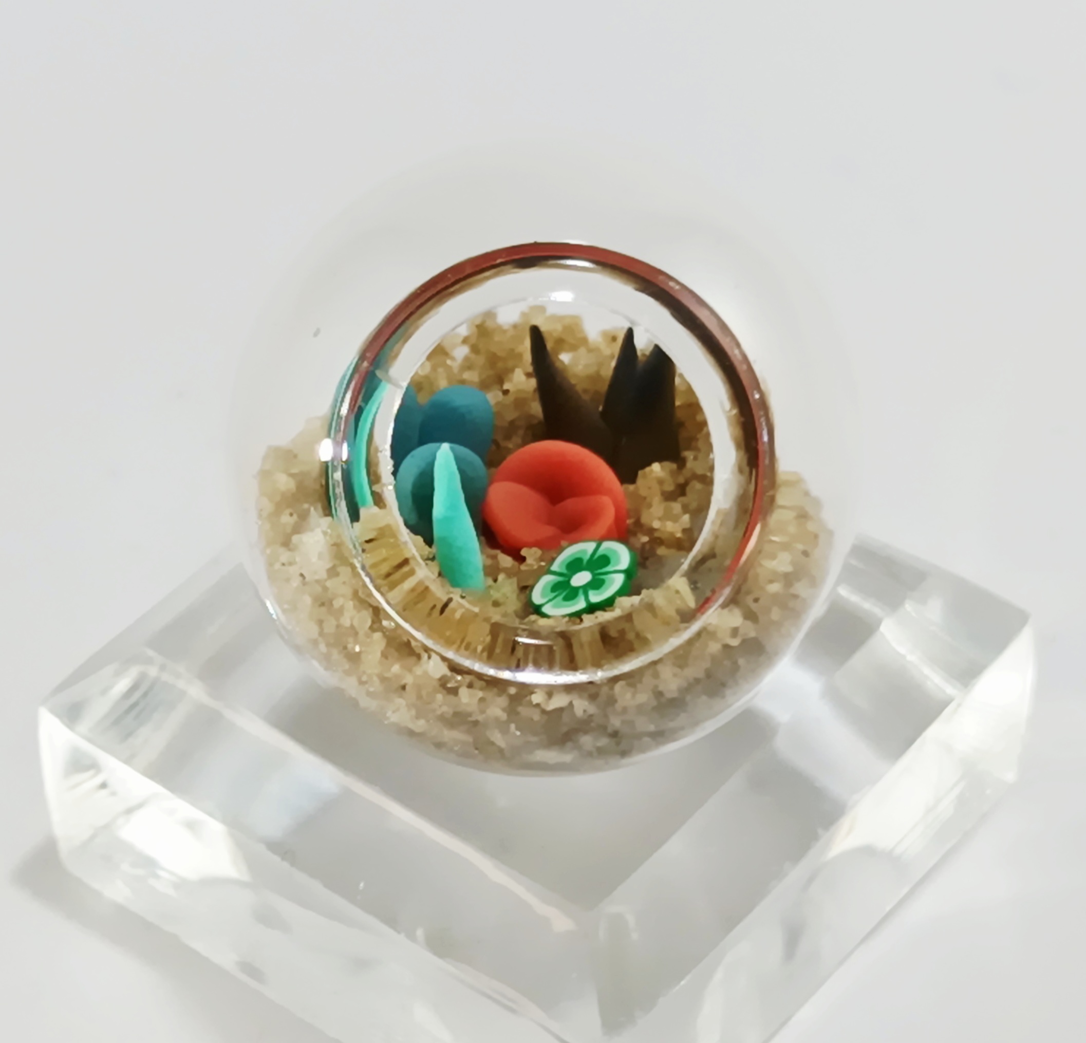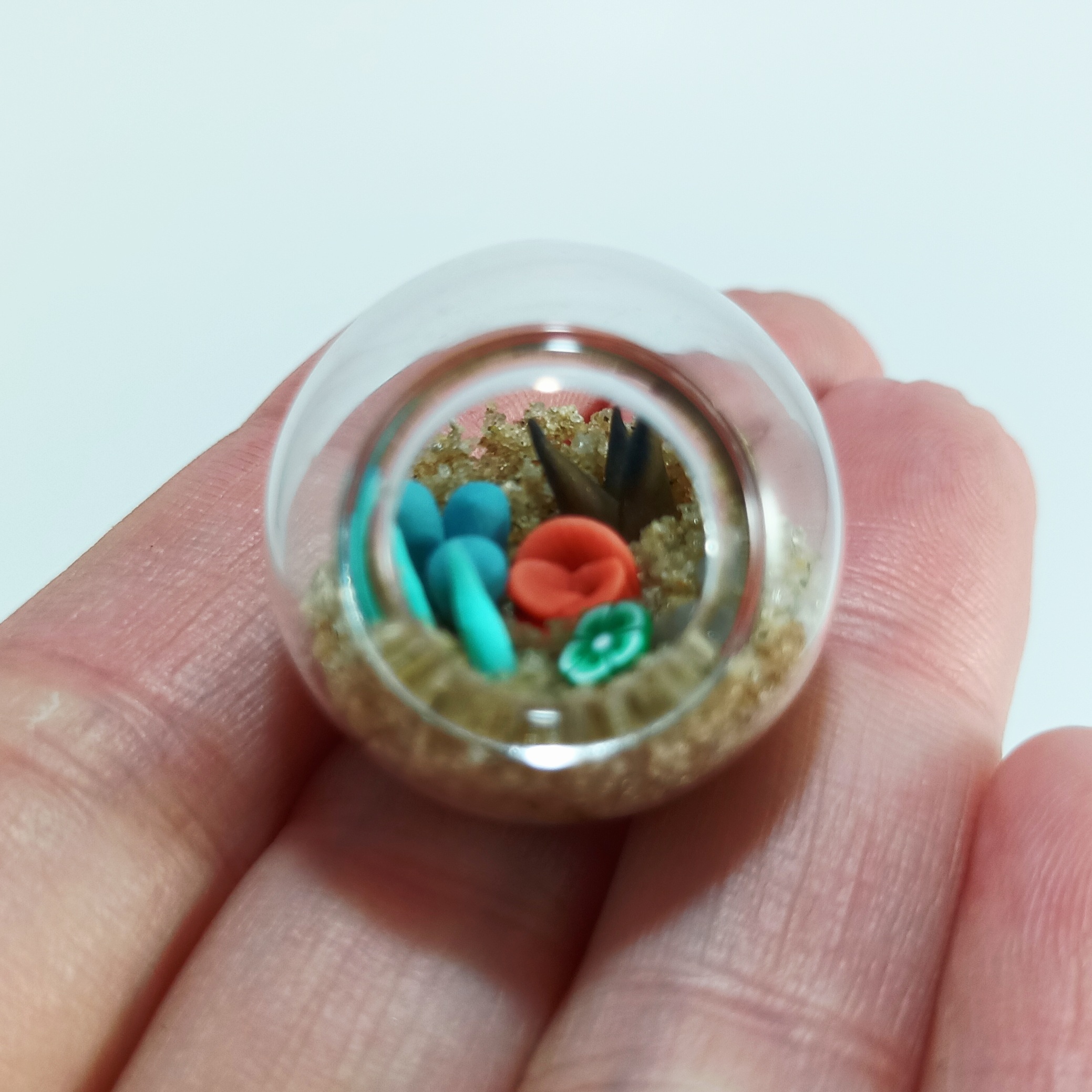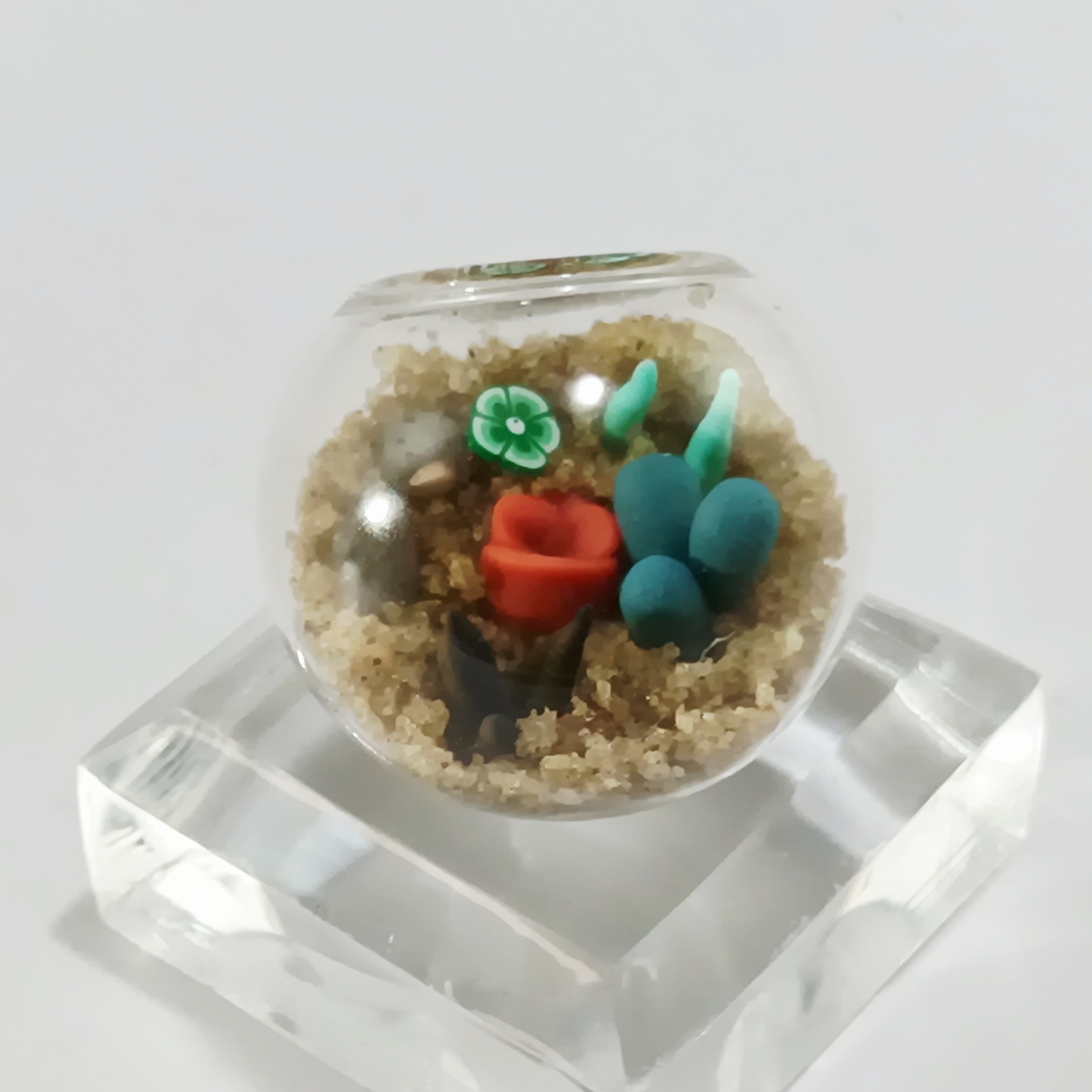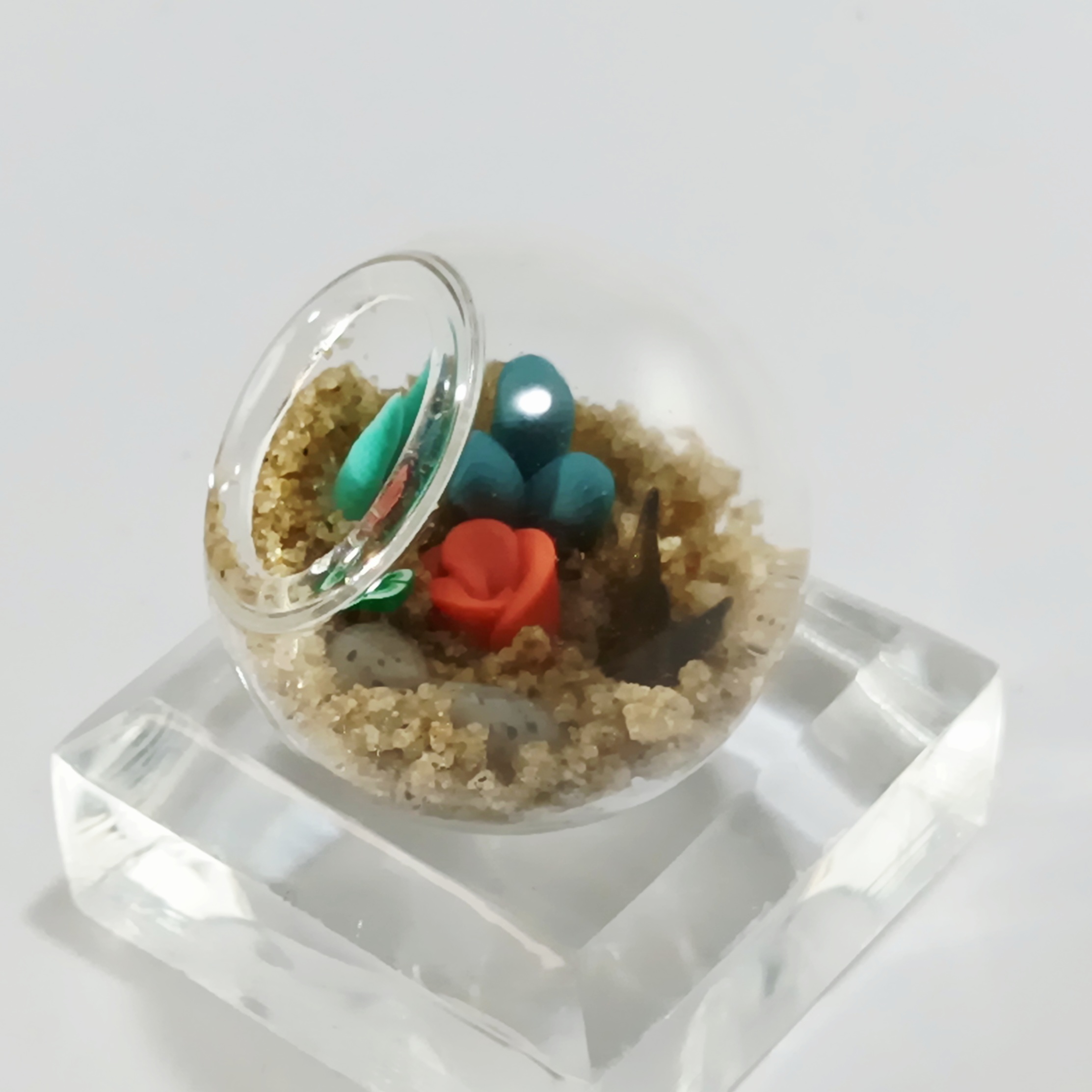 This glass micro terrarium (less than an inch!) features hand-sculpted clay plants nestled in real hardened sand for lasting stability. Each plant is lovingly handmade from polymer or air-dry clay—a real forever garden.