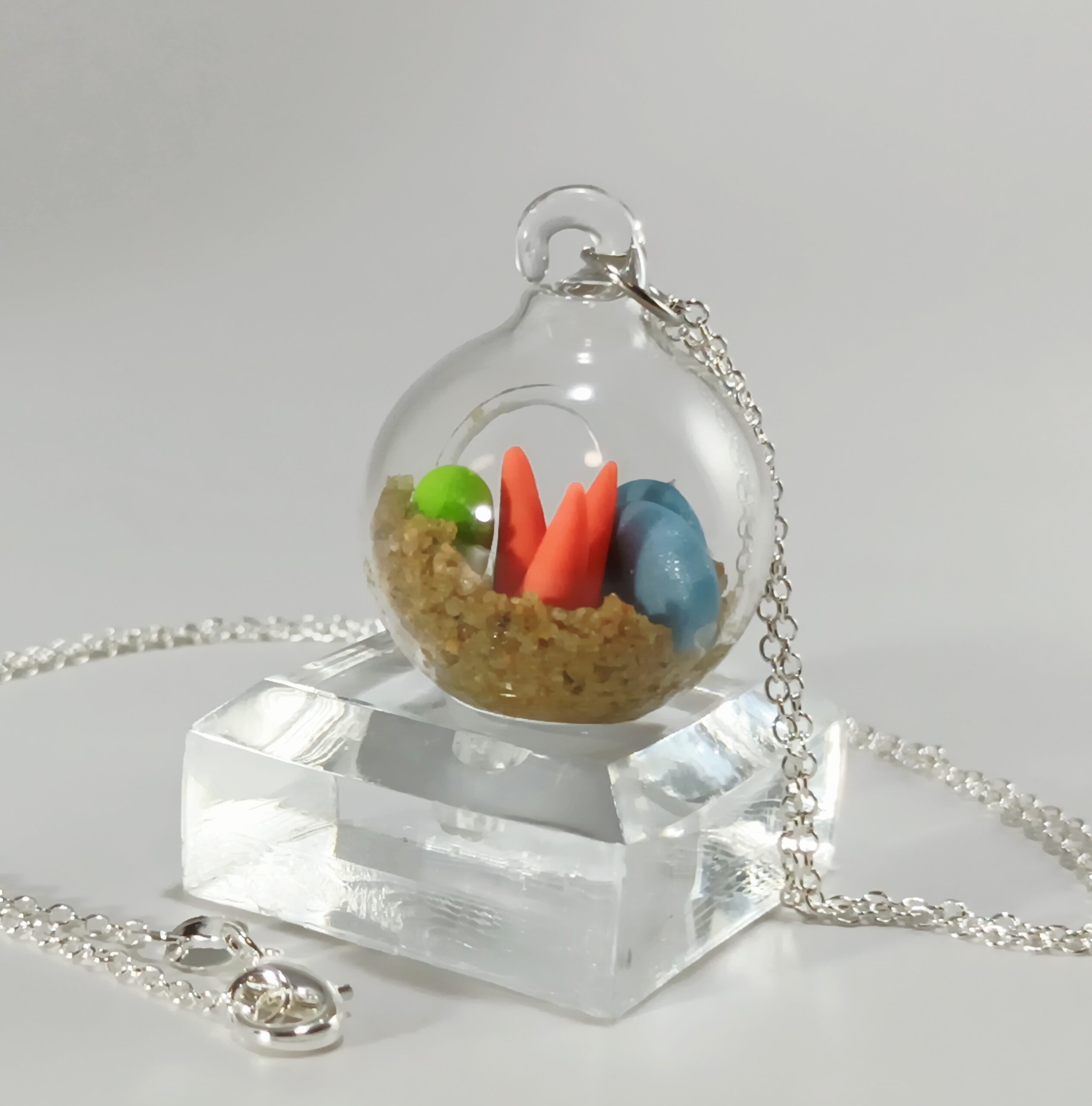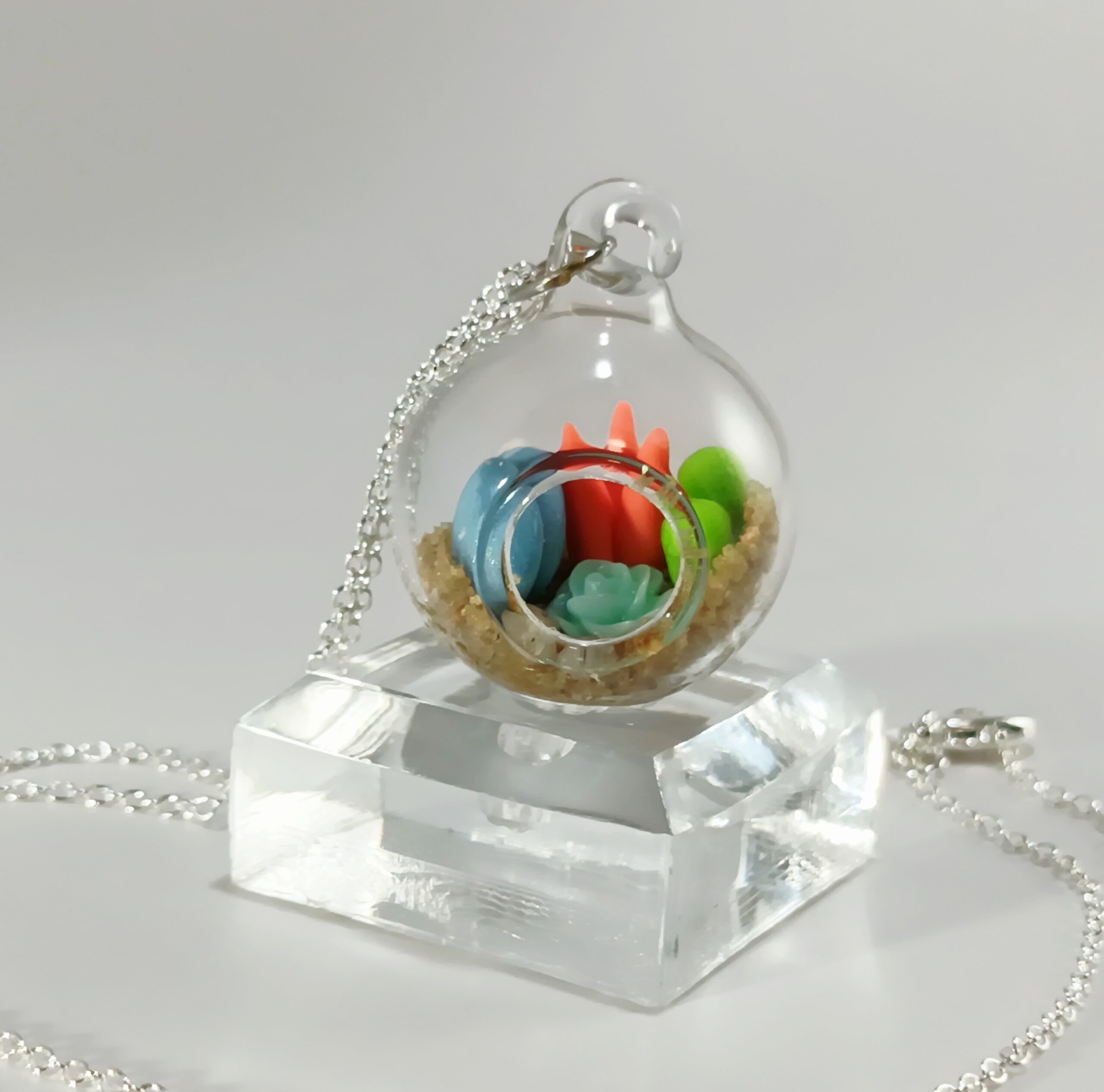 Each terrarium is hung on a 22″ gold plated chain with lobster clasp.