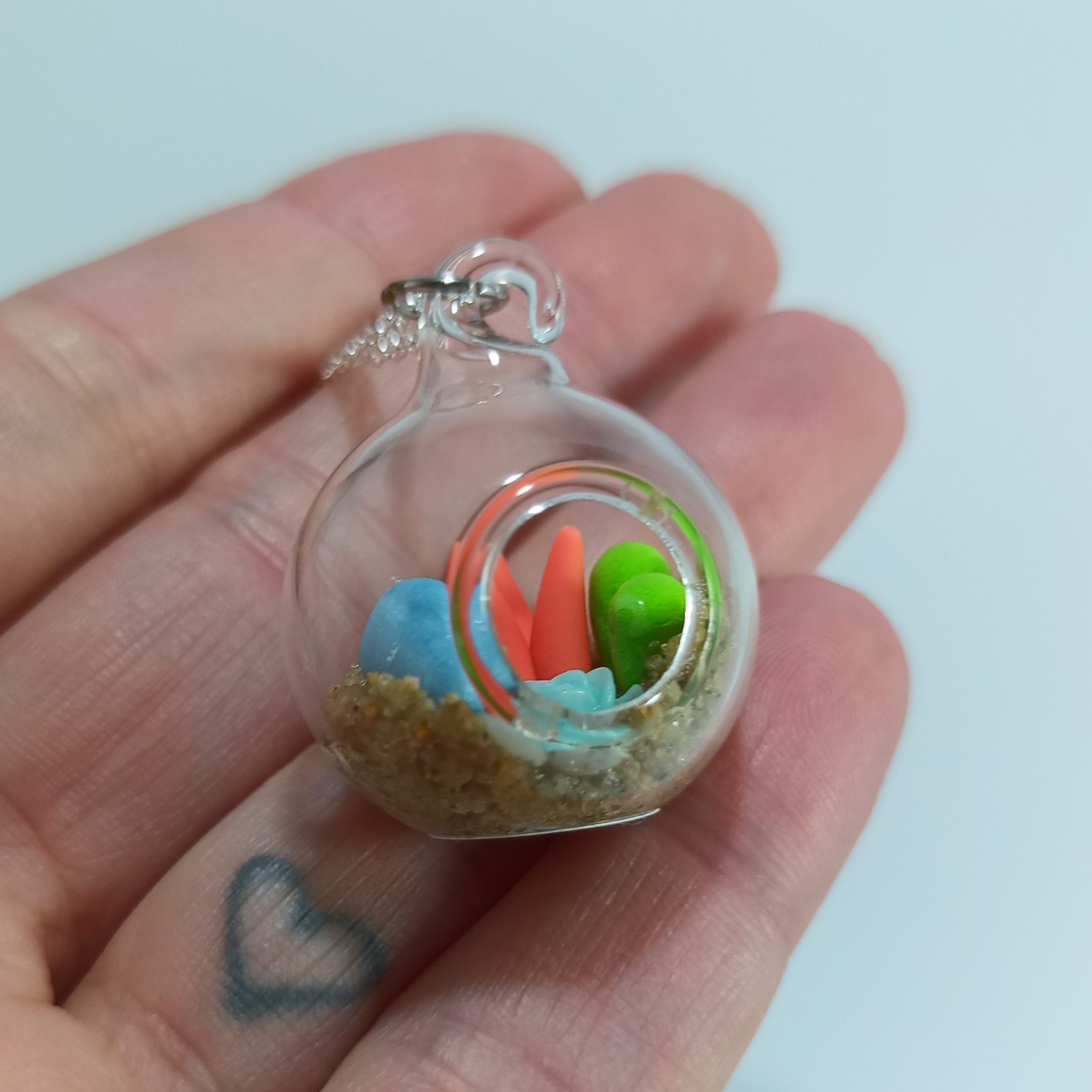 Handmade micro clay plants inside of a glass terrarium with real sand hardened with glue. Each plant is individually made with polymer or air dry clay and is super tiny. Each one is a little different since they are all handmade. No two terrariums are the same so you’re sure to receive a unique tiny garden just for you!