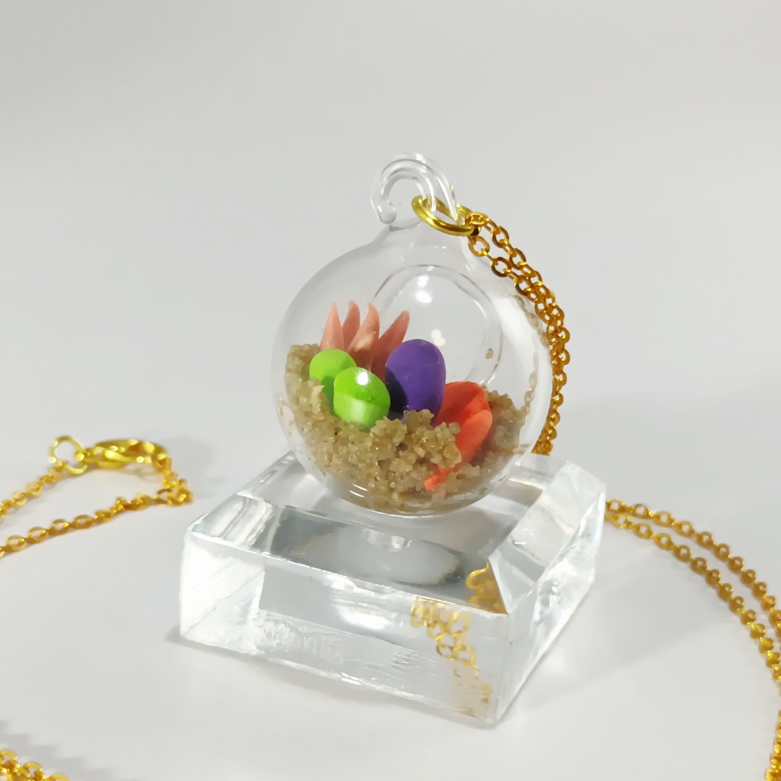 Each terrarium is hung on a 22″ gold plated chain with lobster clasp.