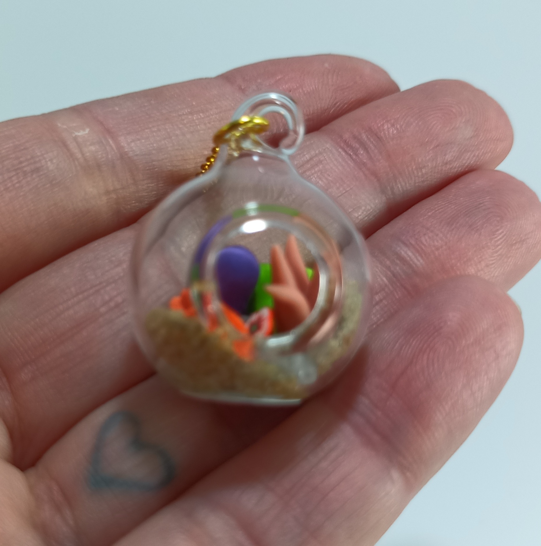 Handmade micro clay plants inside of a glass terrarium with real sand hardened with glue. Each plant is individually made with polymer or air dry clay and is super tiny. Each one is a little different since they are all handmade. No two terrariums are the same so you’re sure to receive a unique tiny garden just for you!