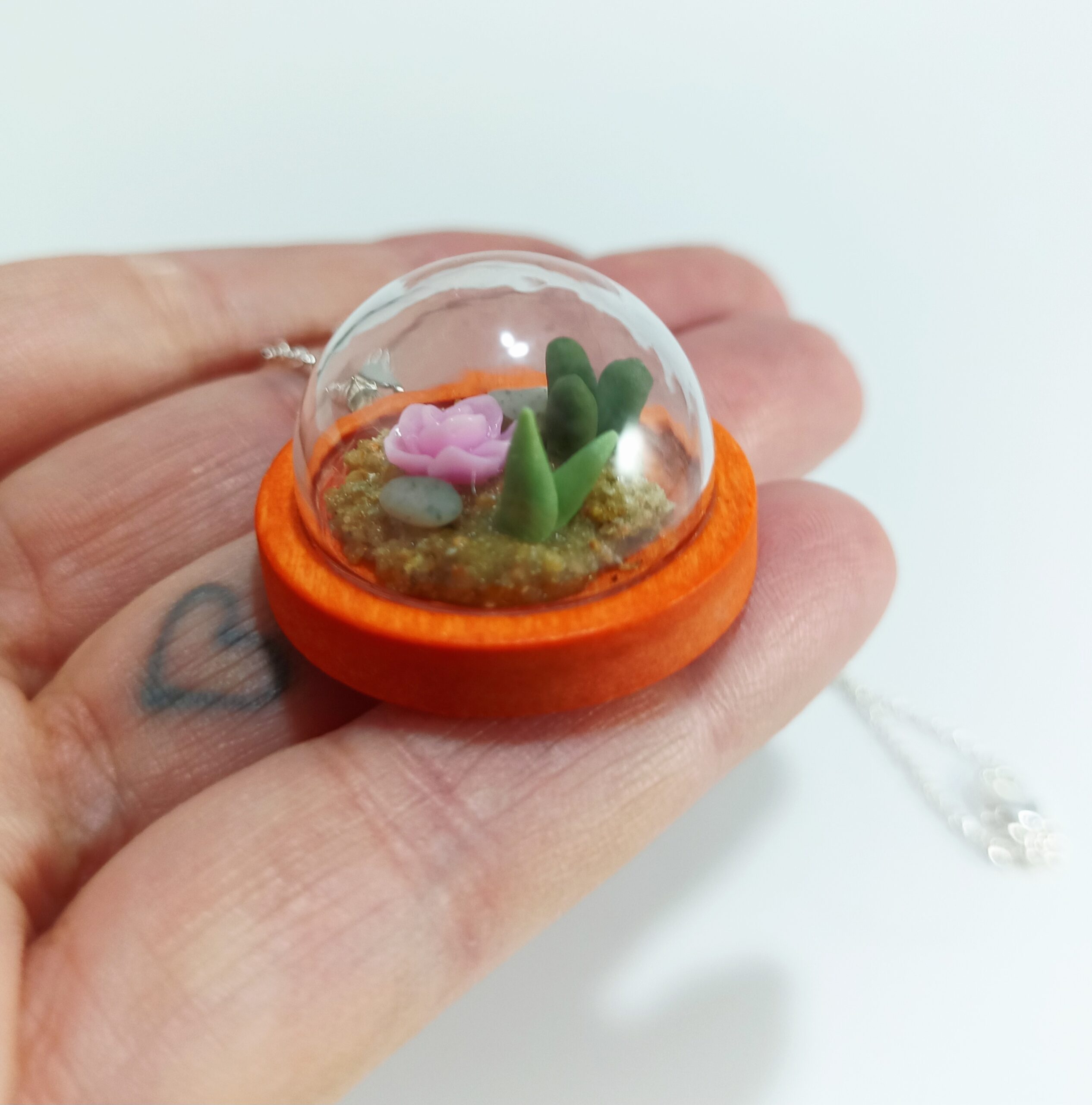 Handmade micro clay plants inside of a glass terrarium with real sand hardened with glue. Each plant is individually made with polymer or air dry clay and is super tiny. Each one is a little different since they are all handmade. No two terrariums are the same so you’re sure to receive a unique tiny garden just for you!