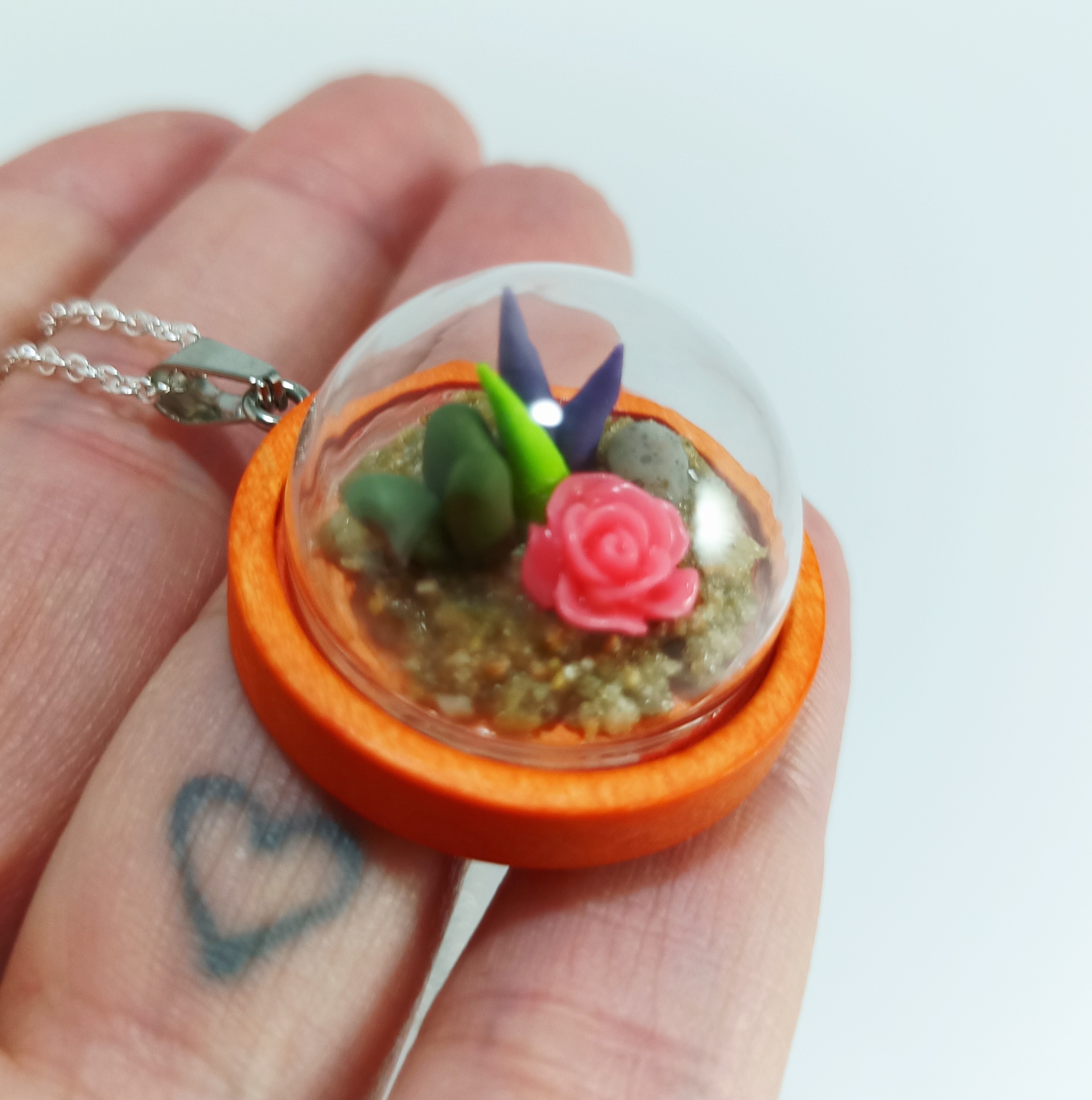 Each terrarium is hung on a 22″ gold plated chain with lobster clasp.