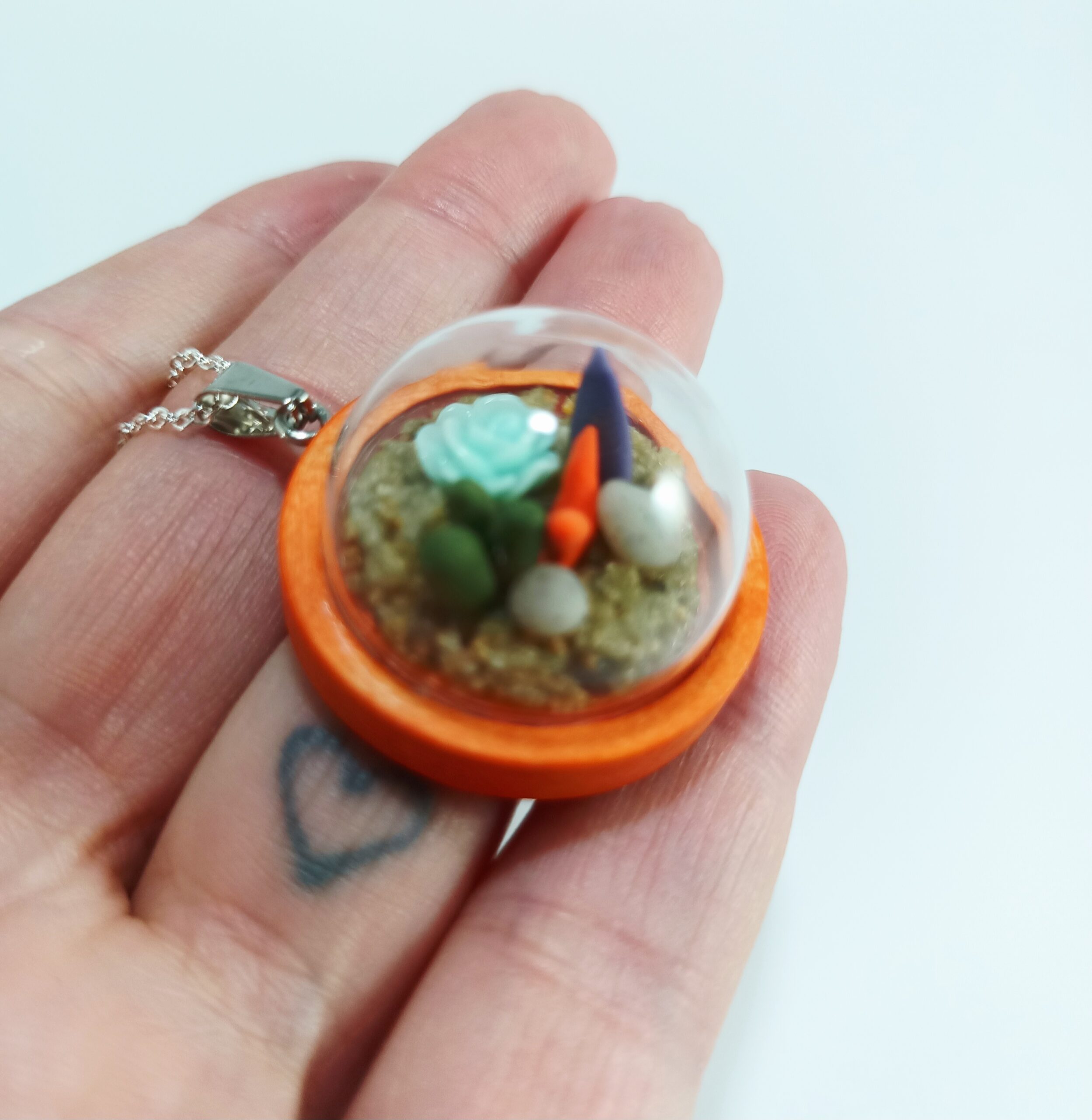 Handmade micro clay plants inside of a glass terrarium with real sand hardened with glue. Each plant is individually made with polymer or air dry clay and is super tiny. Each one is a little different since they are all handmade. No two terrariums are the same so you’re sure to receive a unique tiny garden just for you!
