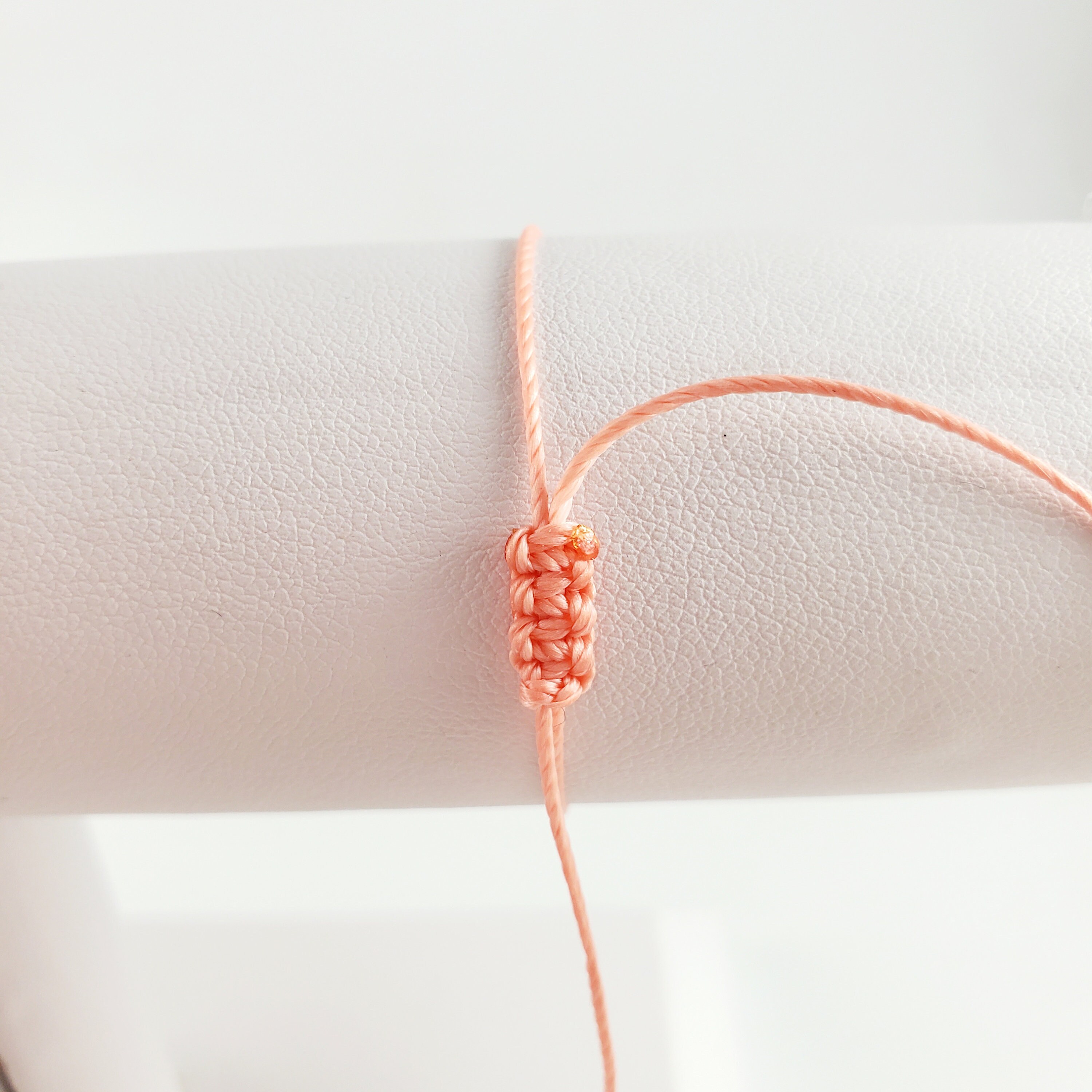 Each bracelet is made from nylon thread with a single bead securely knotted on both ends. The bracelet is made with a box knot closure, meant to be easily removable by pulling the strings. Each string is finished with a knotted clear glass bead at each end.