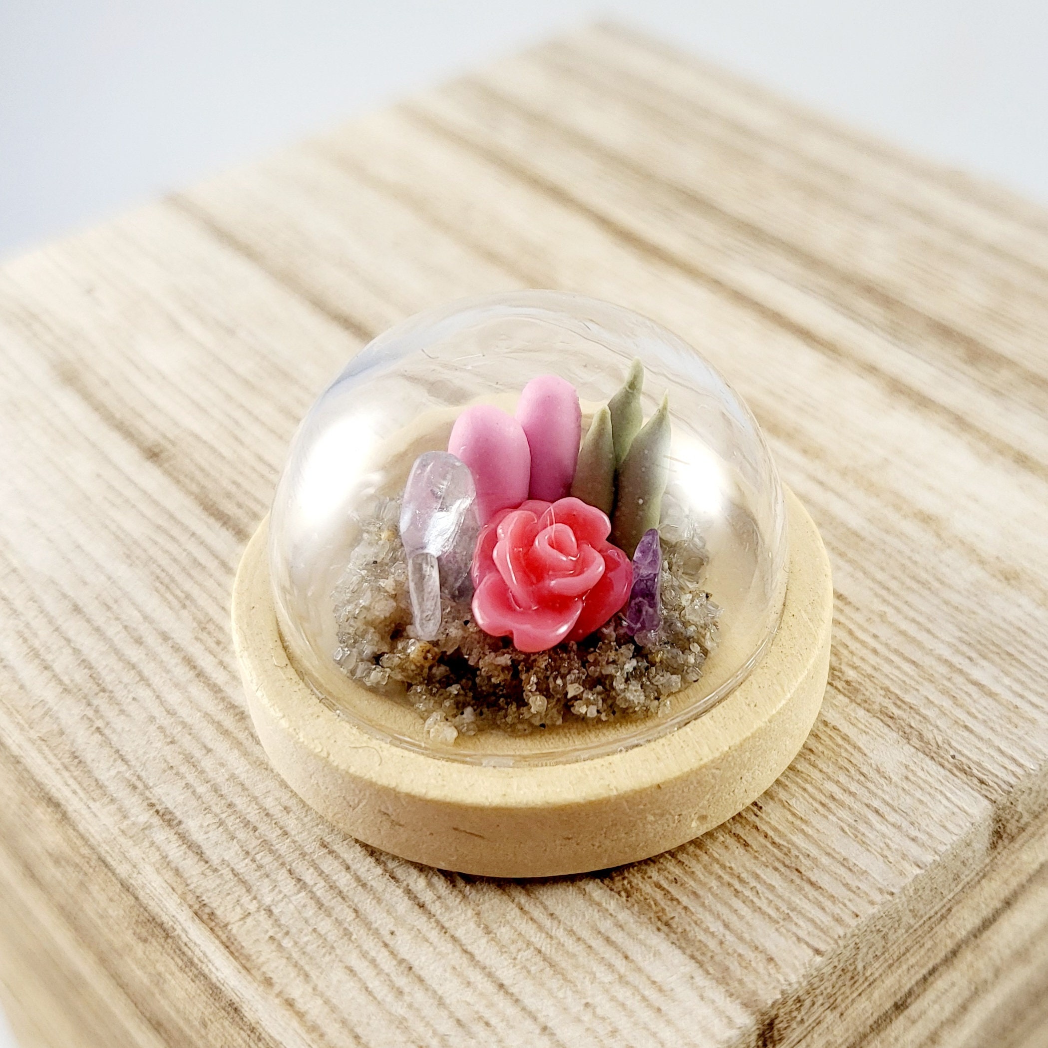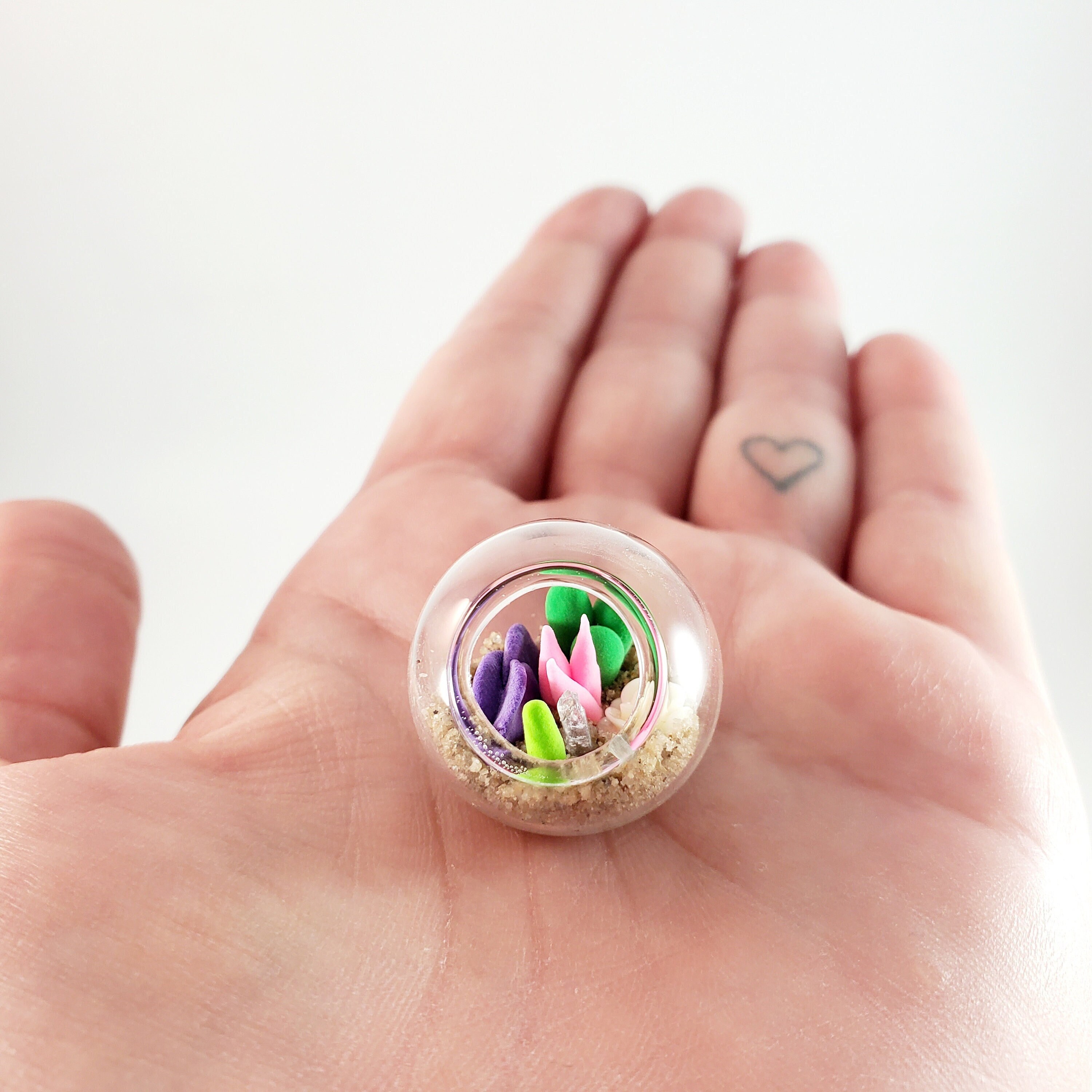 Micro clay plants inside of a glass terrarium with real sand hardened with glue. Each plant is handmade with polymer or air dry clay and is super tiny. Each one is a little different since they are all handmade. No two terrariums are the same so you’re sure to receive a unique tiny garden just for you!
