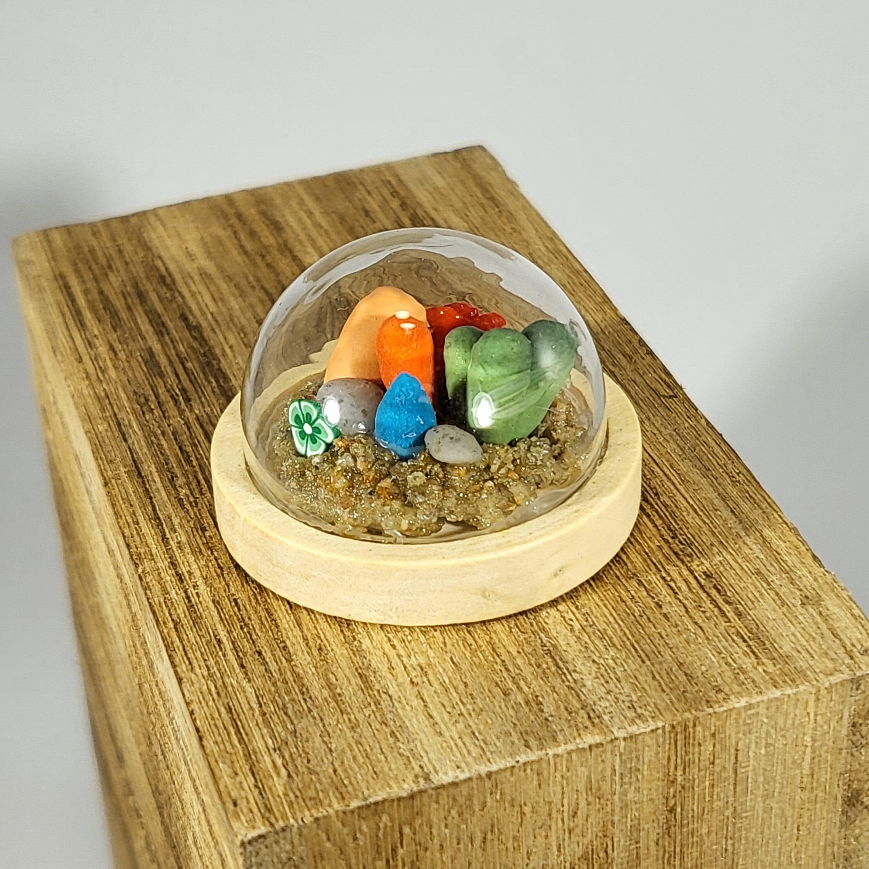 Micro clay plants inside of a glass terrarium with real sand hardened with glue. Each plant is handmade with polymer or air dry clay and is super tiny. Each one is a little different since they are all handmade. No two terrariums are the same so you’re sure to receive a unique tiny garden just for you!