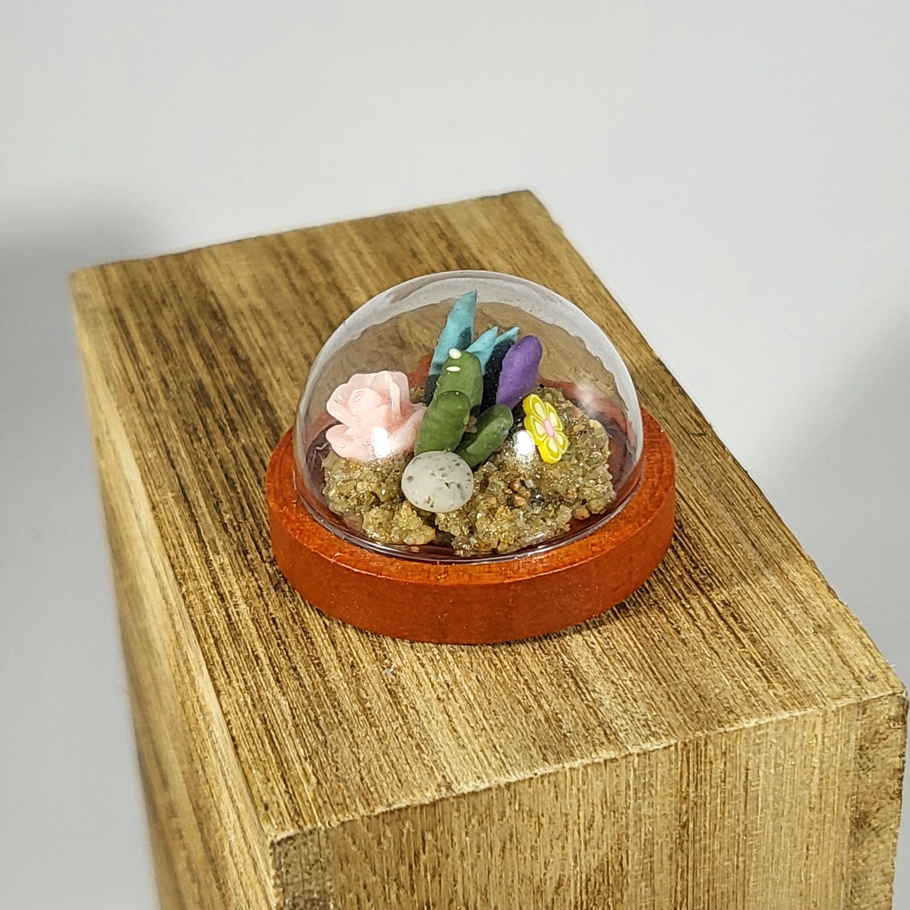Micro clay plants inside of a glass terrarium with real sand hardened with glue. Each plant is handmade with polymer or air dry clay and is super tiny. Each one is a little different since they are all handmade. No two terrariums are the same so you’re sure to receive a unique tiny garden just for you!