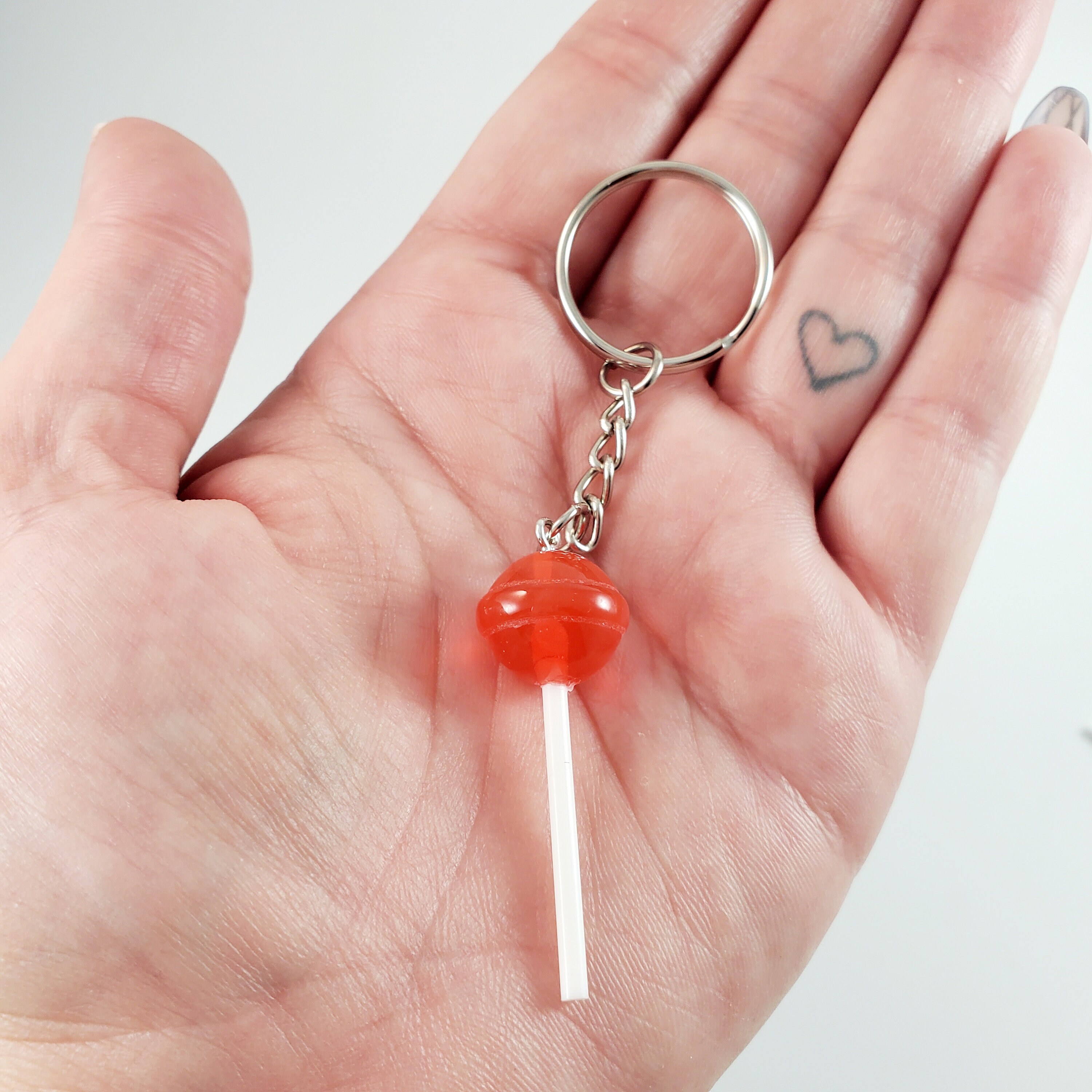 Colorful cherry red resin lollipop on high grade stainless steel split key ring.