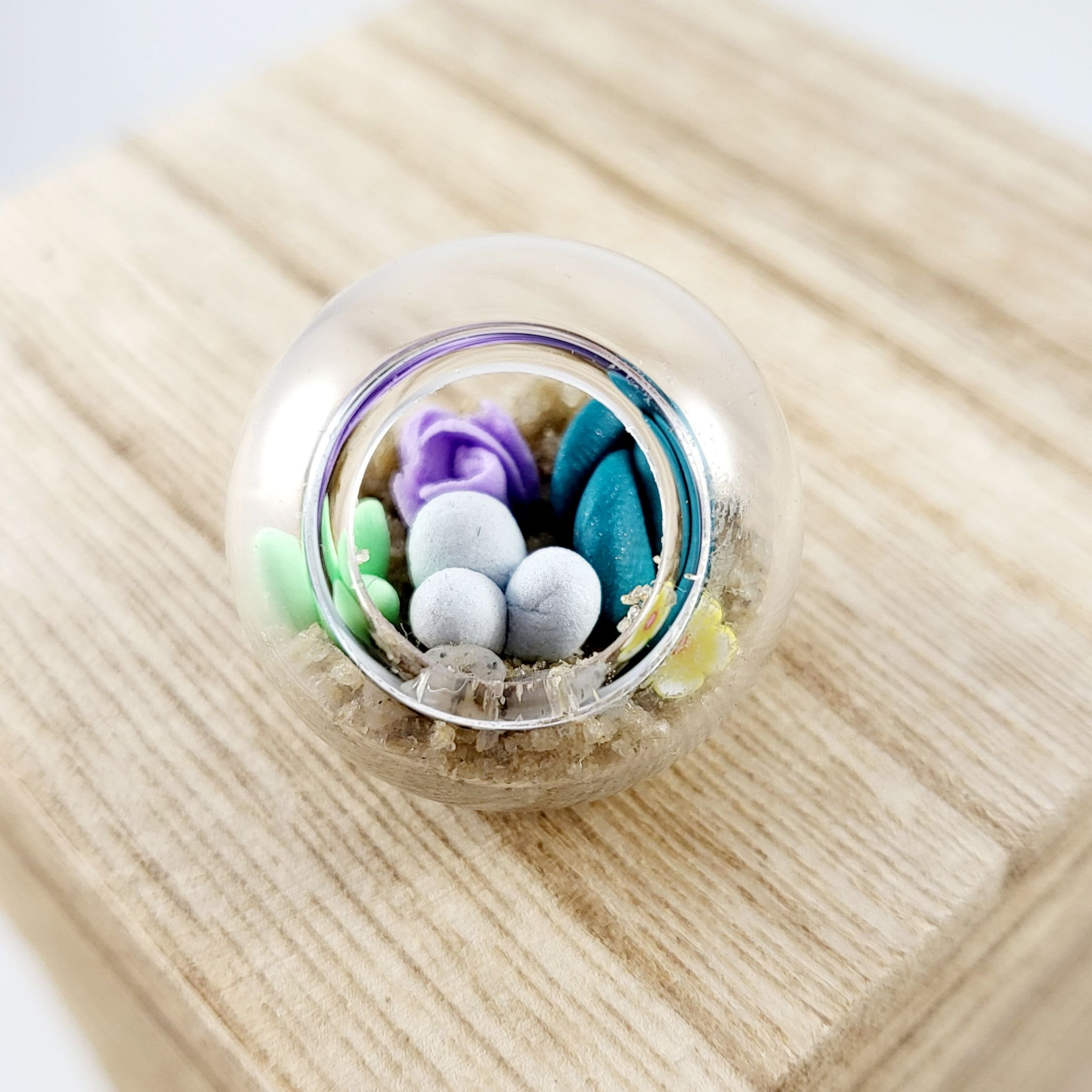 Micro clay plants inside of a glass terrarium with real sand hardened with glue. Each plant is handmade with polymer or air dry clay and is super tiny. Each one is a little different since they are all handmade. No two terrariums are the same so you’re sure to receive a unique tiny garden just for you!