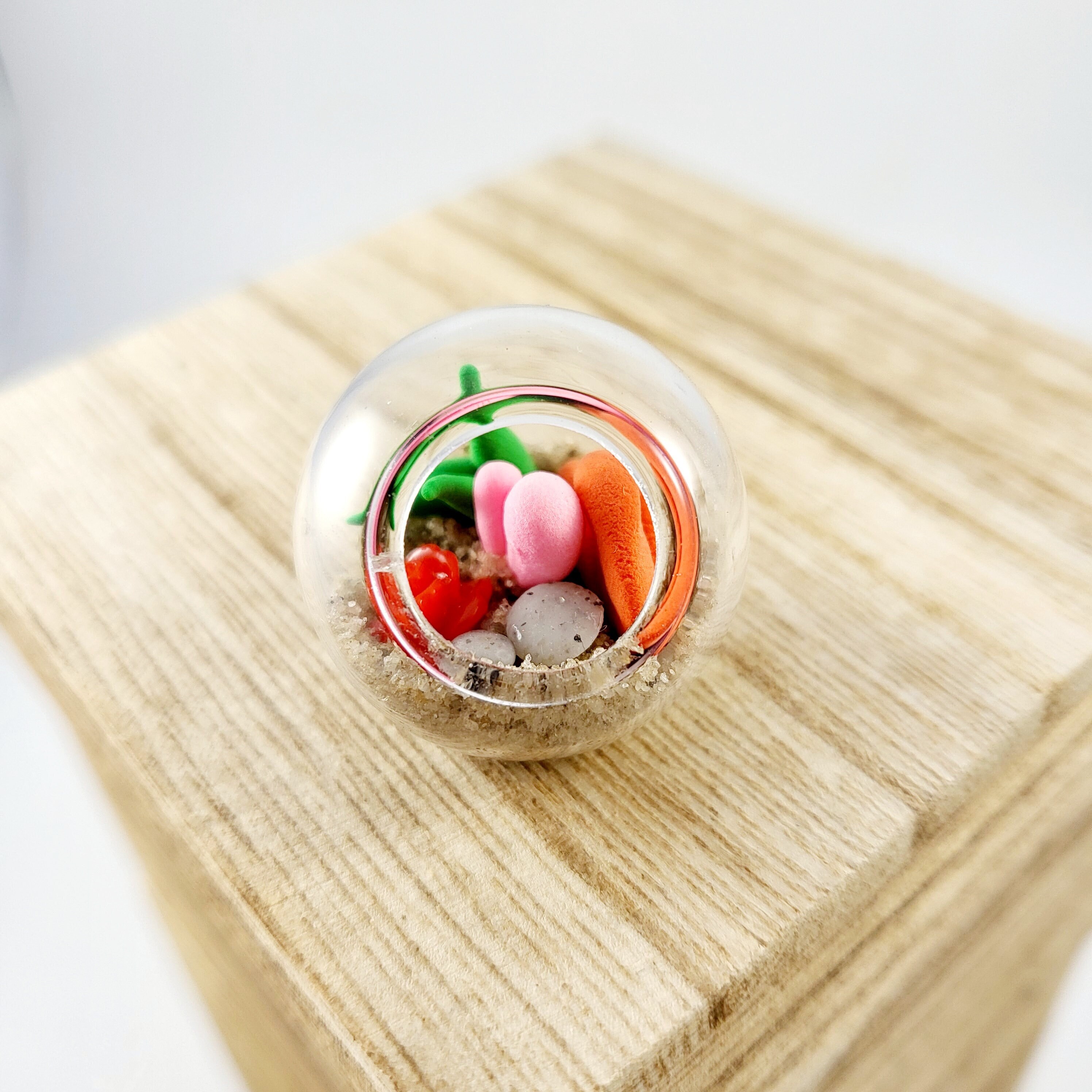 Micro clay plants inside of a glass terrarium with real sand hardened with glue. Each plant is handmade with polymer or air dry clay and is super tiny. Each one is a little different since they are all handmade. No two terrariums are the same so you’re sure to receive a unique tiny garden just for you!