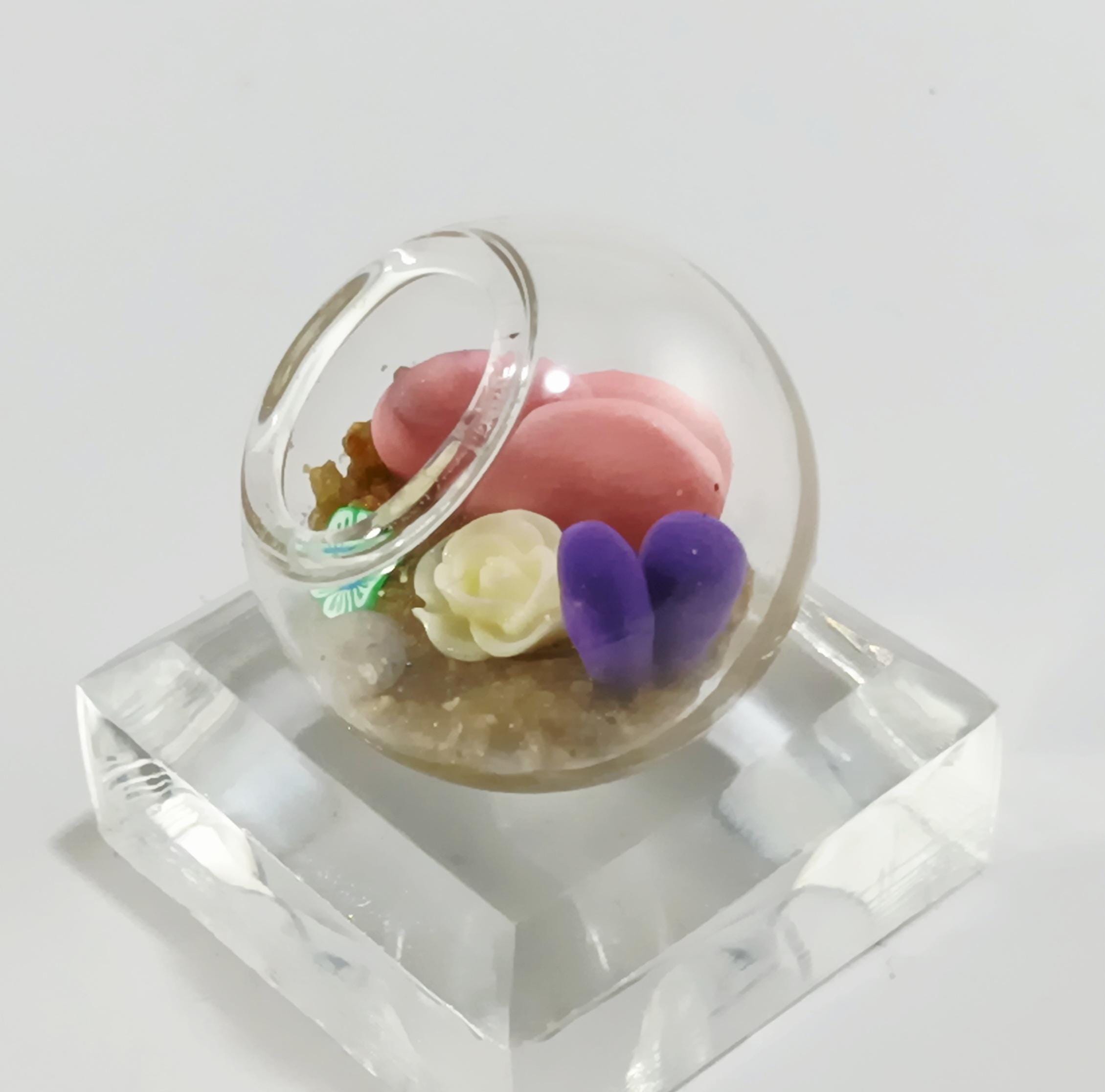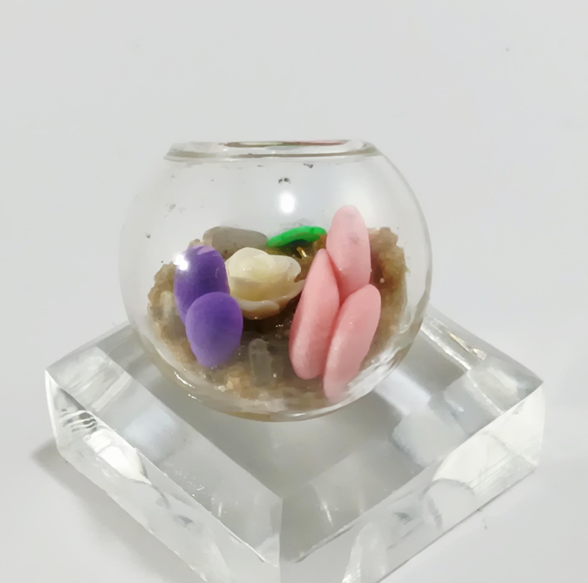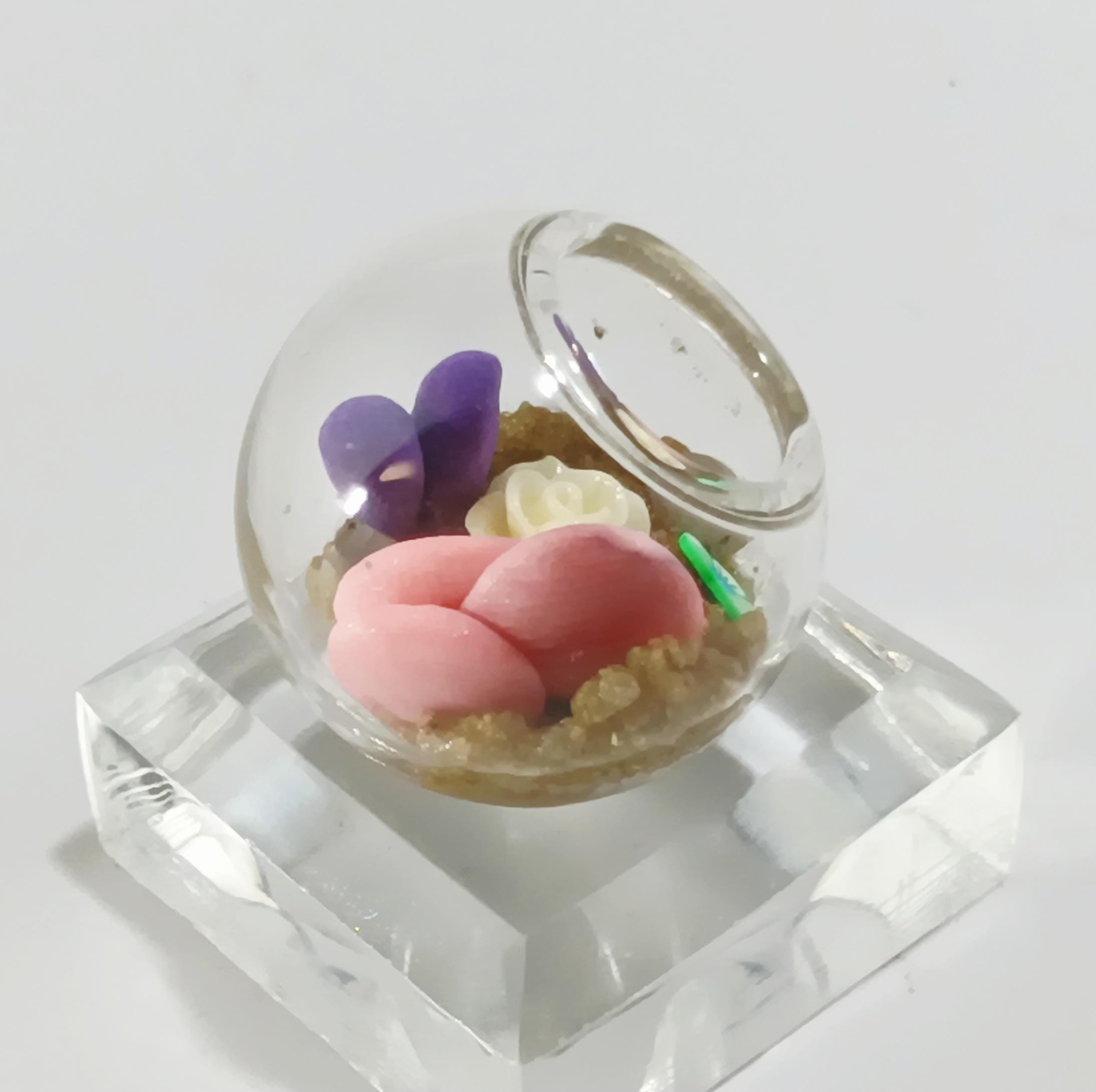 Micro clay plants inside of a glass terrarium with real sand hardened with glue. Each plant is handmade with polymer or air dry clay and is super tiny. Each one is a little different since they are all handmade. No two terrariums are the same so you’re sure to receive a unique tiny garden just for you!