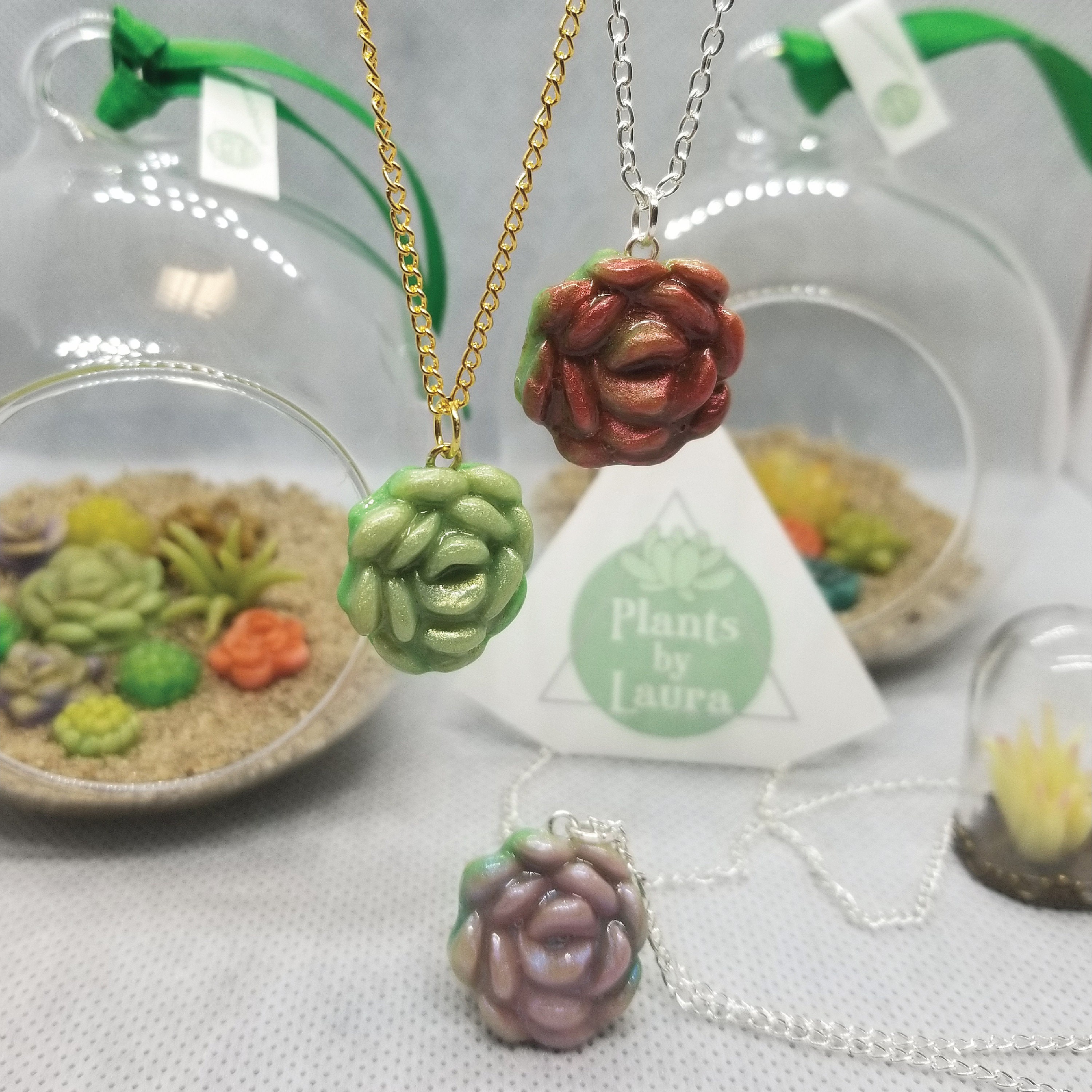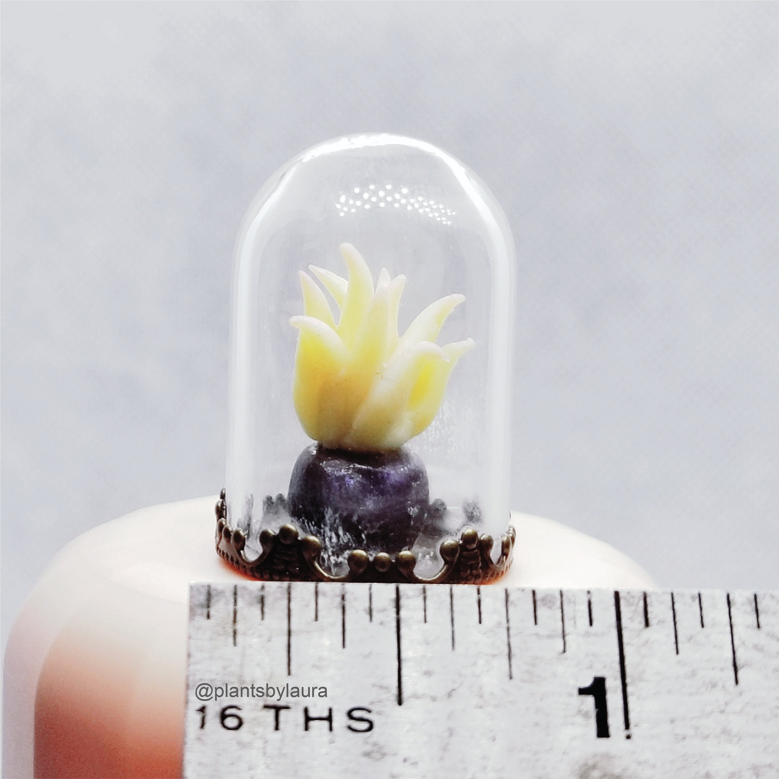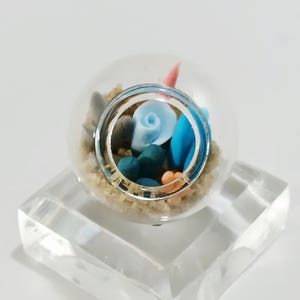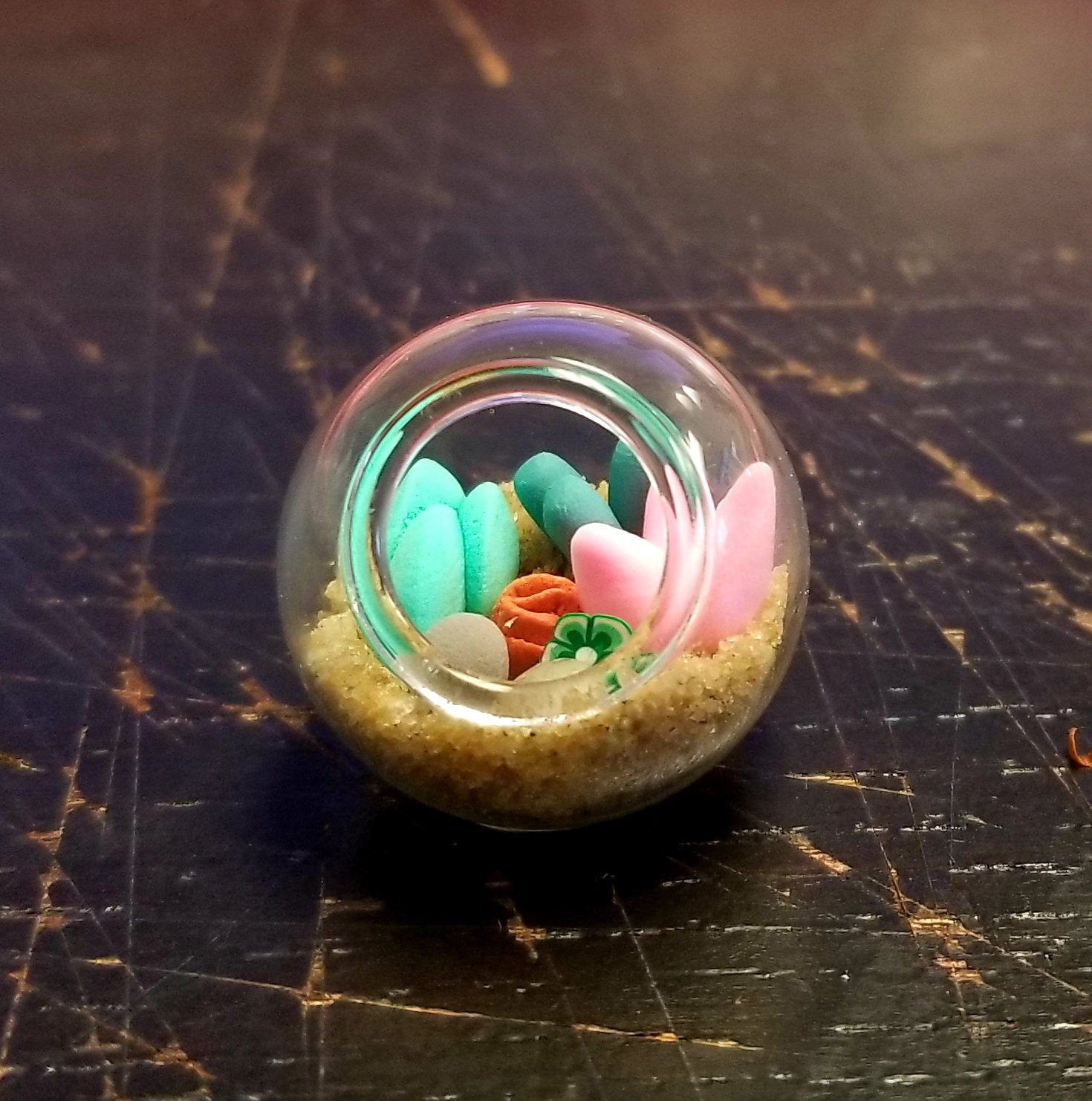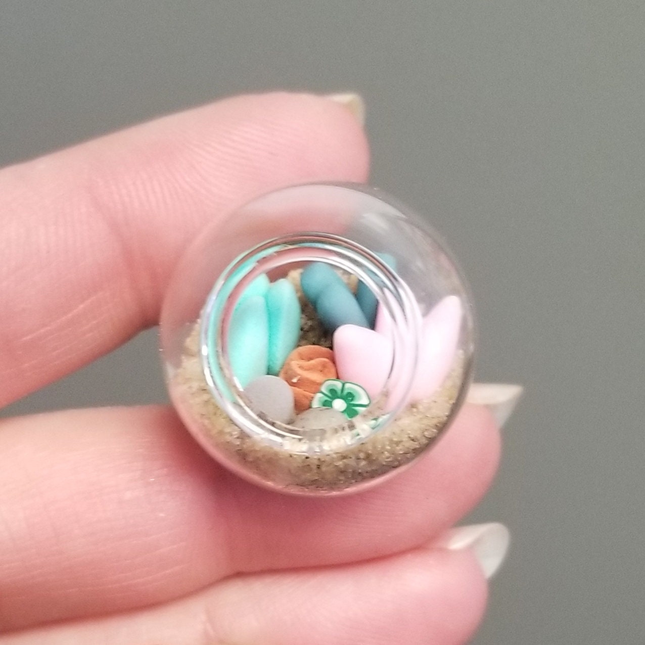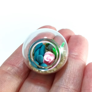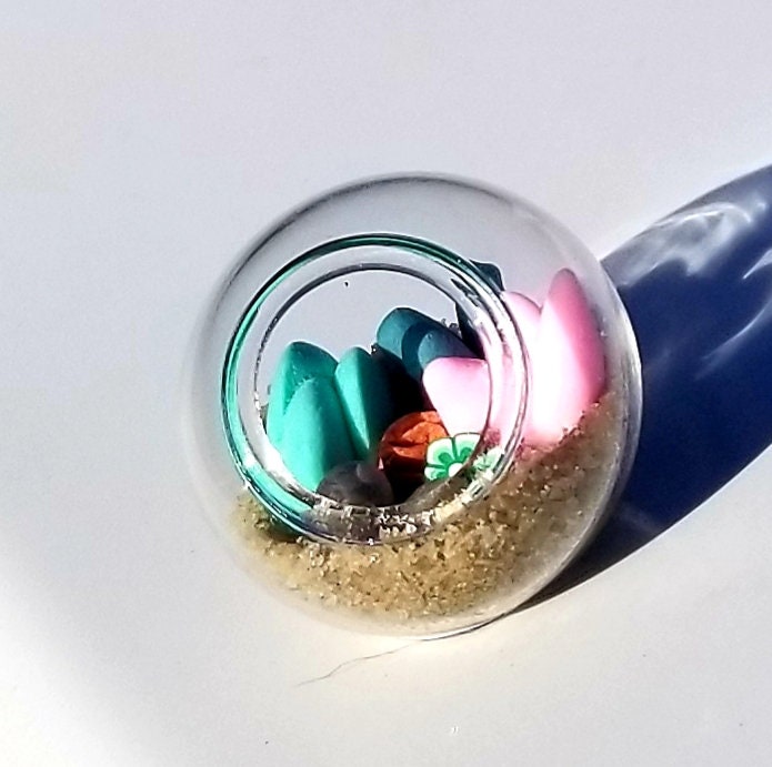 Micro clay plants inside of a glass terrarium with real sand hardened with glue. Each plant is handmade with polymer or air dry clay and is super tiny. Each one is a little different since they are all handmade. No two terrariums are the same so you’re sure to receive a unique tiny garden just for you!