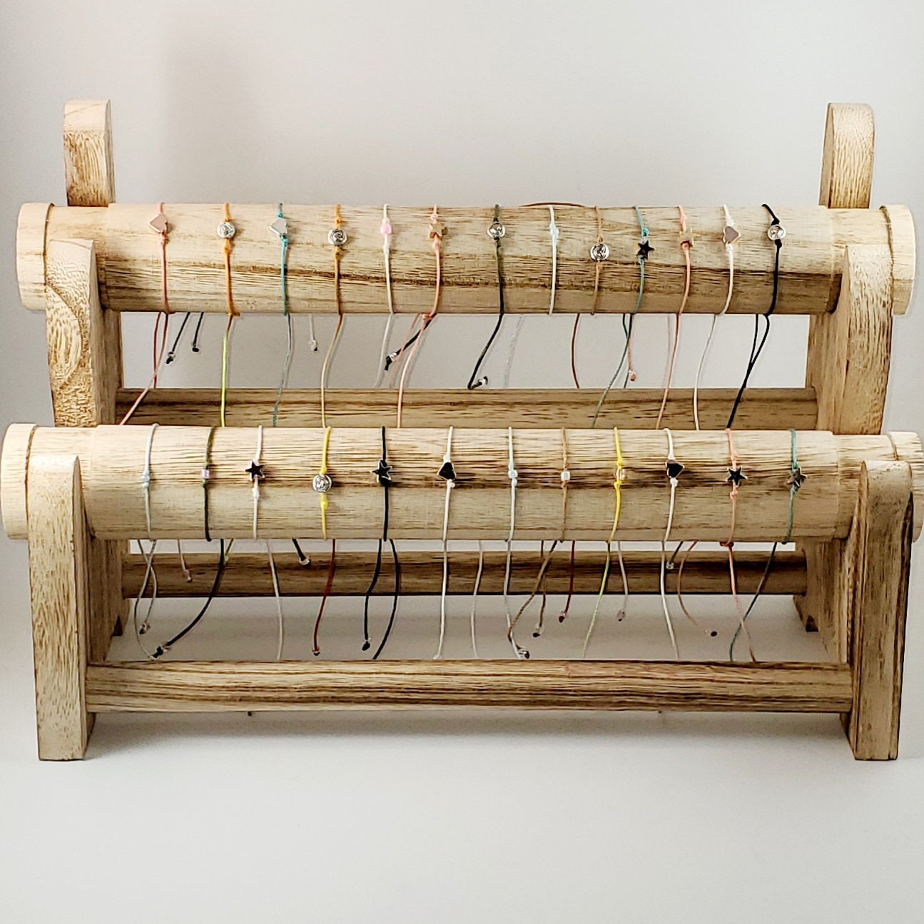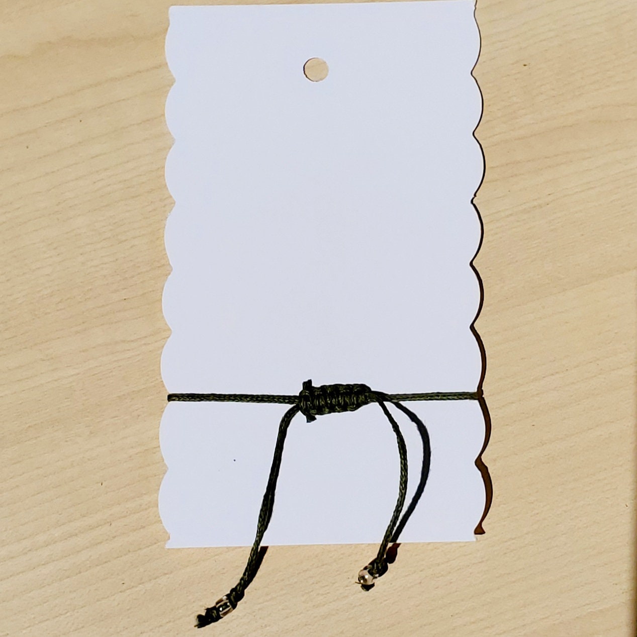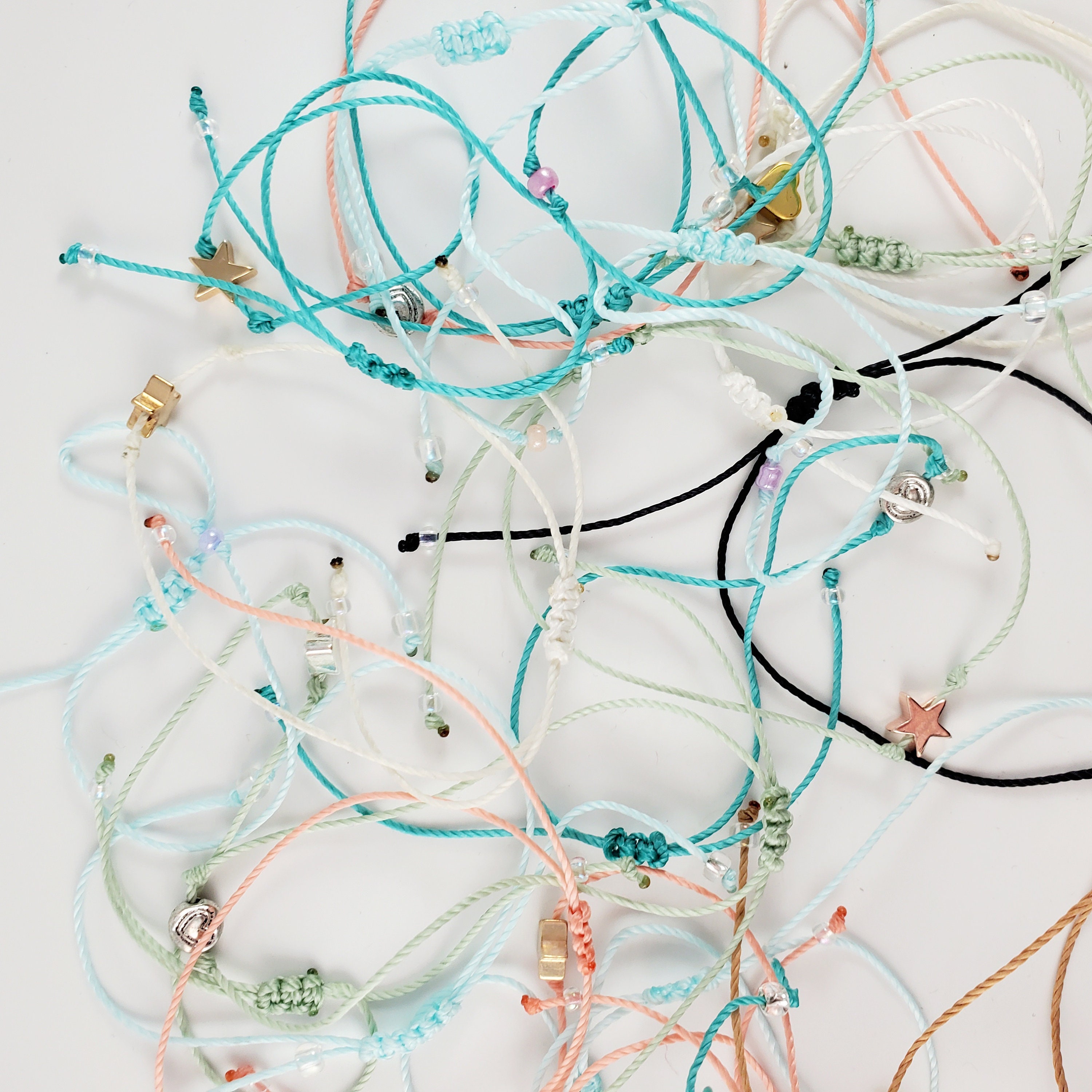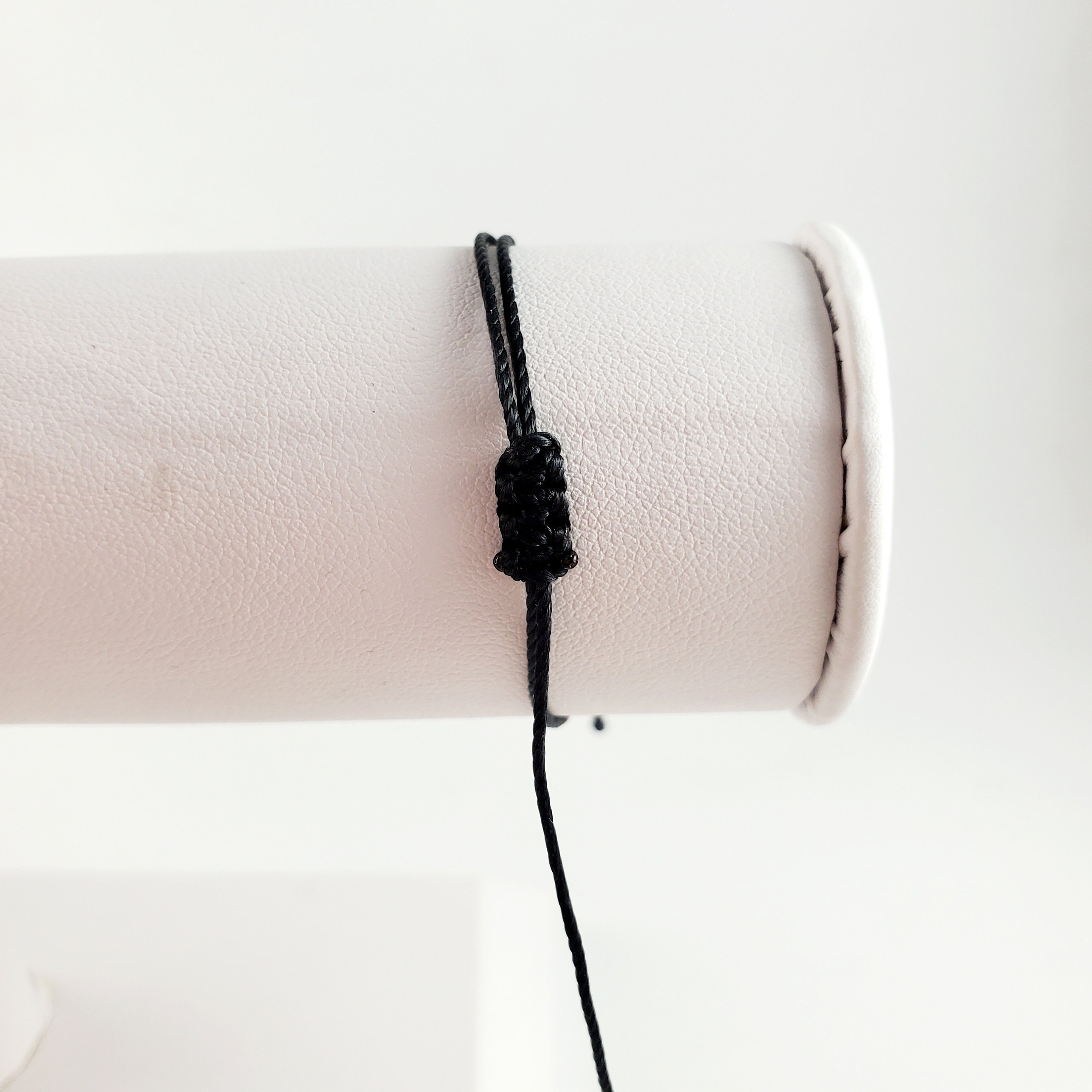 Each bracelet is made from nylon thread with a single bead securely knotted on both ends. The bracelet is made with a box knot closure, meant to be easily removable by pulling the strings. Each string is finished with a knotted clear glass bead at each end.